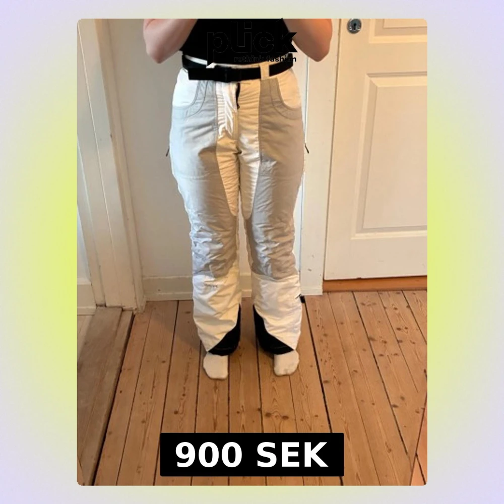 Säljer ett par vita täckbyxor med svarta detaljer vid benslut och midja. Byxorna har hög midja, dragkedja fram och praktiska fickor med dragkedja på sidorna. Materialet är vadderat och passar perfekt för kalla dagar i backen. Snygg passform och stilren design.