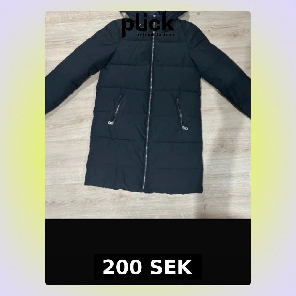 Snygg svart dunjacka med huva och långa ärmar. Jackan har två fickor med dragkedja och en rak, quiltad design. Perfekt för kalla dagar och har en stilren look som passar till det mesta.