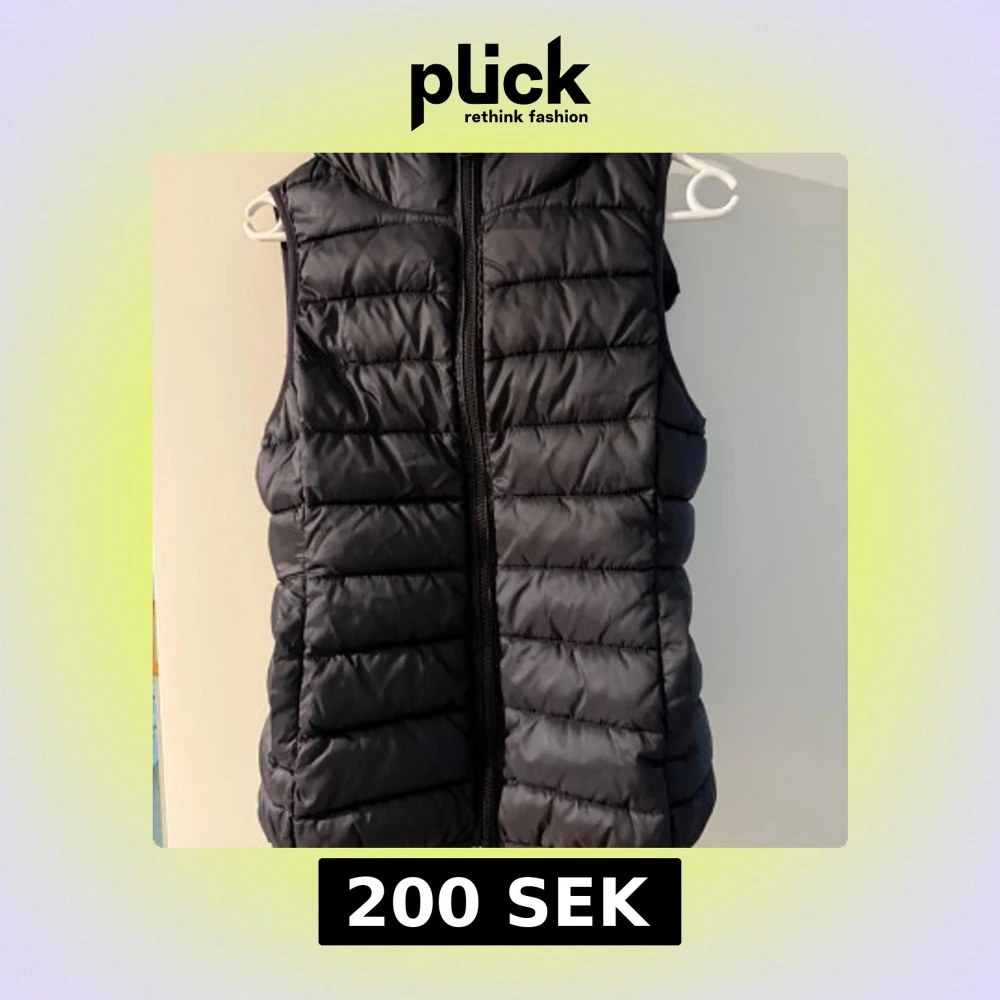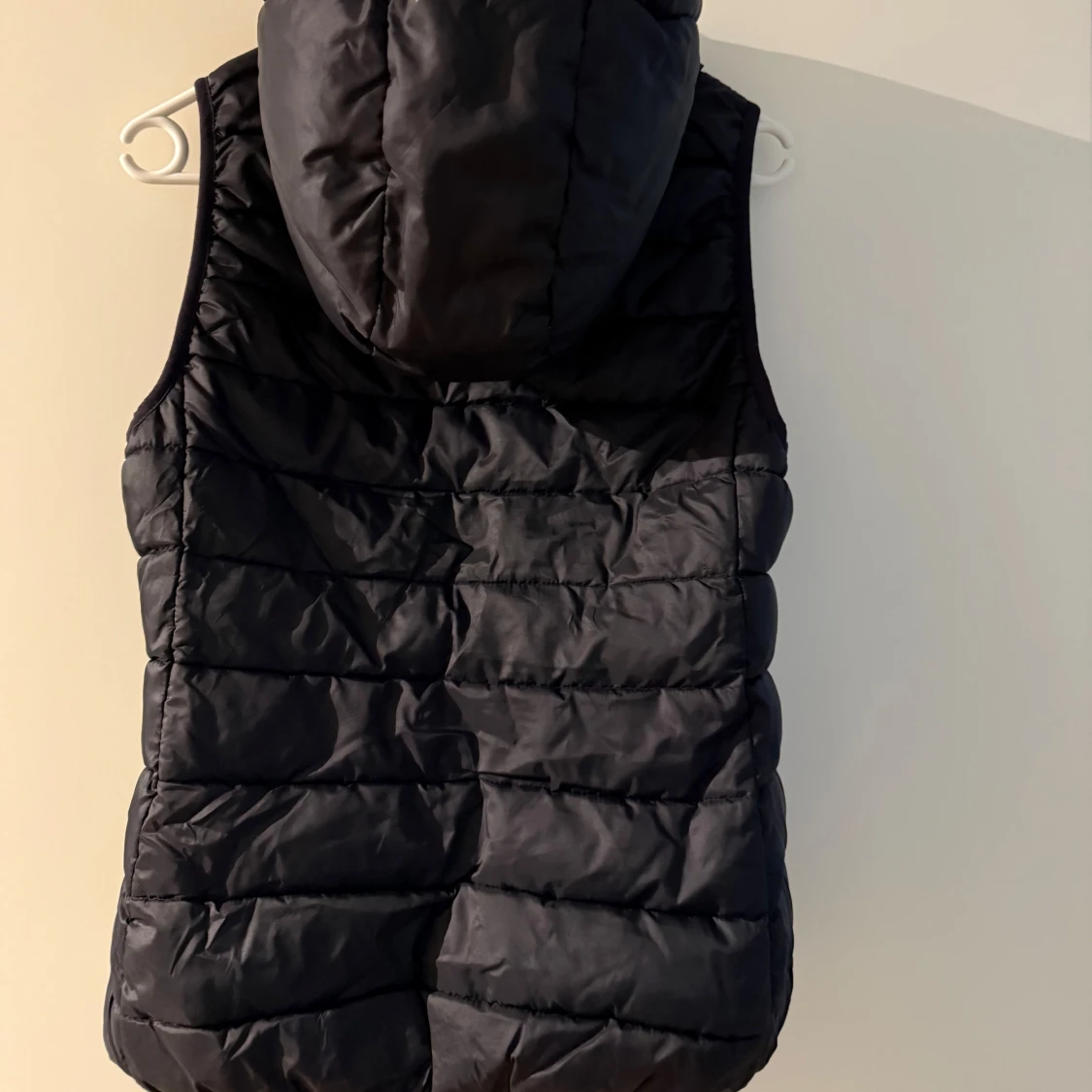 Säljer en svart dunväst med huva och horisontella quiltade sömmar. Västen har dragkedja framtill och är perfekt för lager-på-lager. Enkel och stilren design som funkar till det mesta. Använd enstaka gånger.
