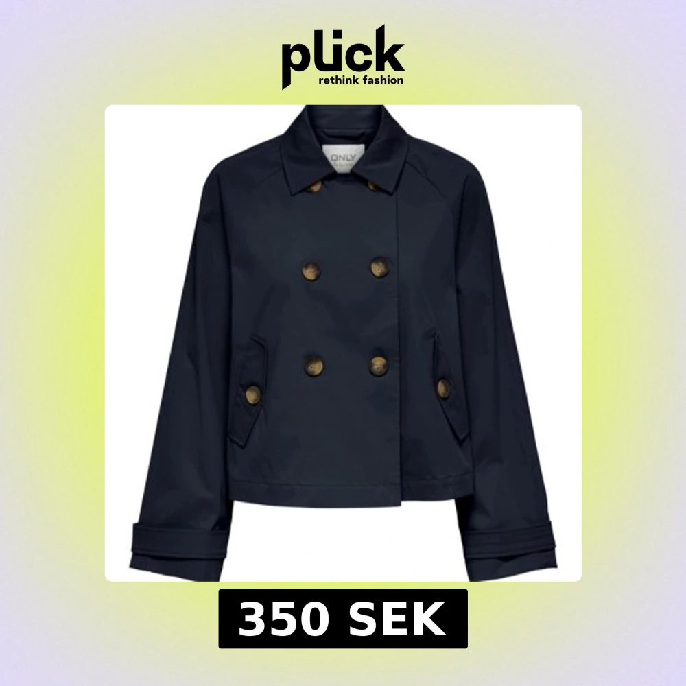 Säljer en oanvänd, ny, mörkblå kort trenchcoat från ONLY med dubbelknäppning. Jackan har klassisk krage, lång ärm och två snedställda fickor framtill. Storlek M men mer som S. Nypris 599,95. https://www.only.com/sv-se/product/15274982_2079/vaandbar-jacka