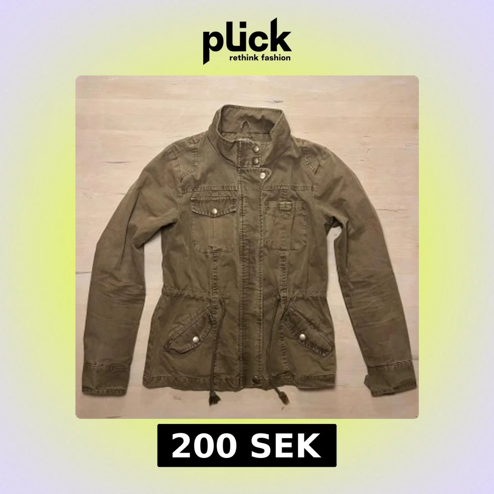 Snygg grön militärjacka från ONLY med hög krage, snörning i midjan och flera fickor med knappstängning. Jackan har dragkedja och tryckknappar framtill, samt långa ärmar. Perfekt för dig som gillar en chill och urban stil. Väldigt fint skick.