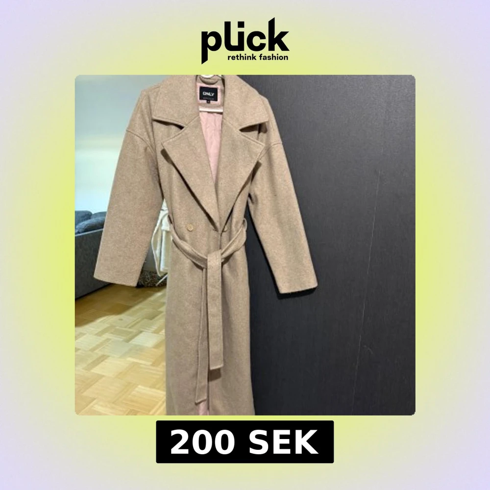 Säljer en beige kappa från ONLY med breda slag, knytskärp i midjan och dubbelknäppning. Jackan har lång ärm och är tillverkad i ullblandning som ger en mjuk och varm känsla. Perfekt för dig som gillar stilrena och klassiska plagg.