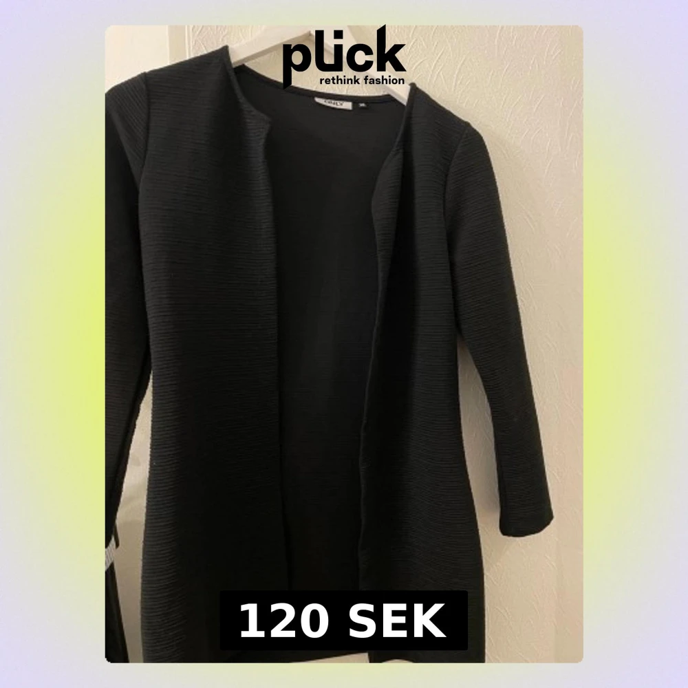 Svart långärmad cardigan jacka från ONLY i storlek XS. Jackan har en öppen front utan knappar eller dragkedja och är tillverkad i ett ribbat syntetmaterial. Perfekt för lager-på-lager och enkel att matcha med olika outfits.