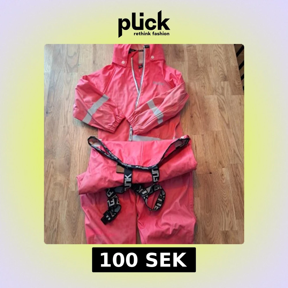 Säljer en rosa regnjacka från Funk i storlek 110. Jackan har en huva och dragkedja framtill samt reflexdetaljer på ärmarna. Materialet är 100% polyester vilket gör den perfekt för regniga dagar. Hängslen ingår för extra komfort och passform.
