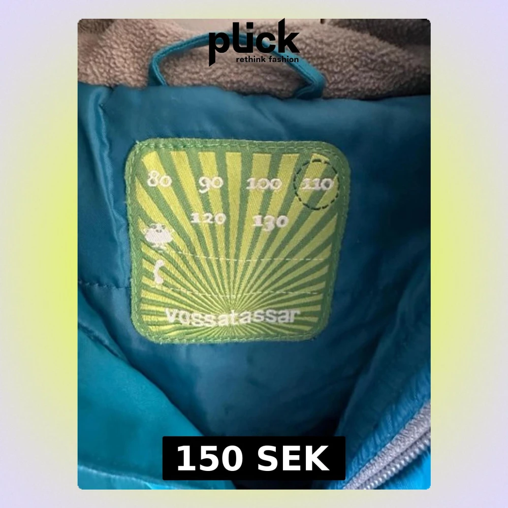 Säljer en blå vindjacka från Vossatassar med huva och grått fleecefoder. Jackan har dragkedja, tryckknappar och flera fickor framtill. Söt liten figur på bröstet och praktisk hängare i nacken. Perfekt för blåsiga dagar!