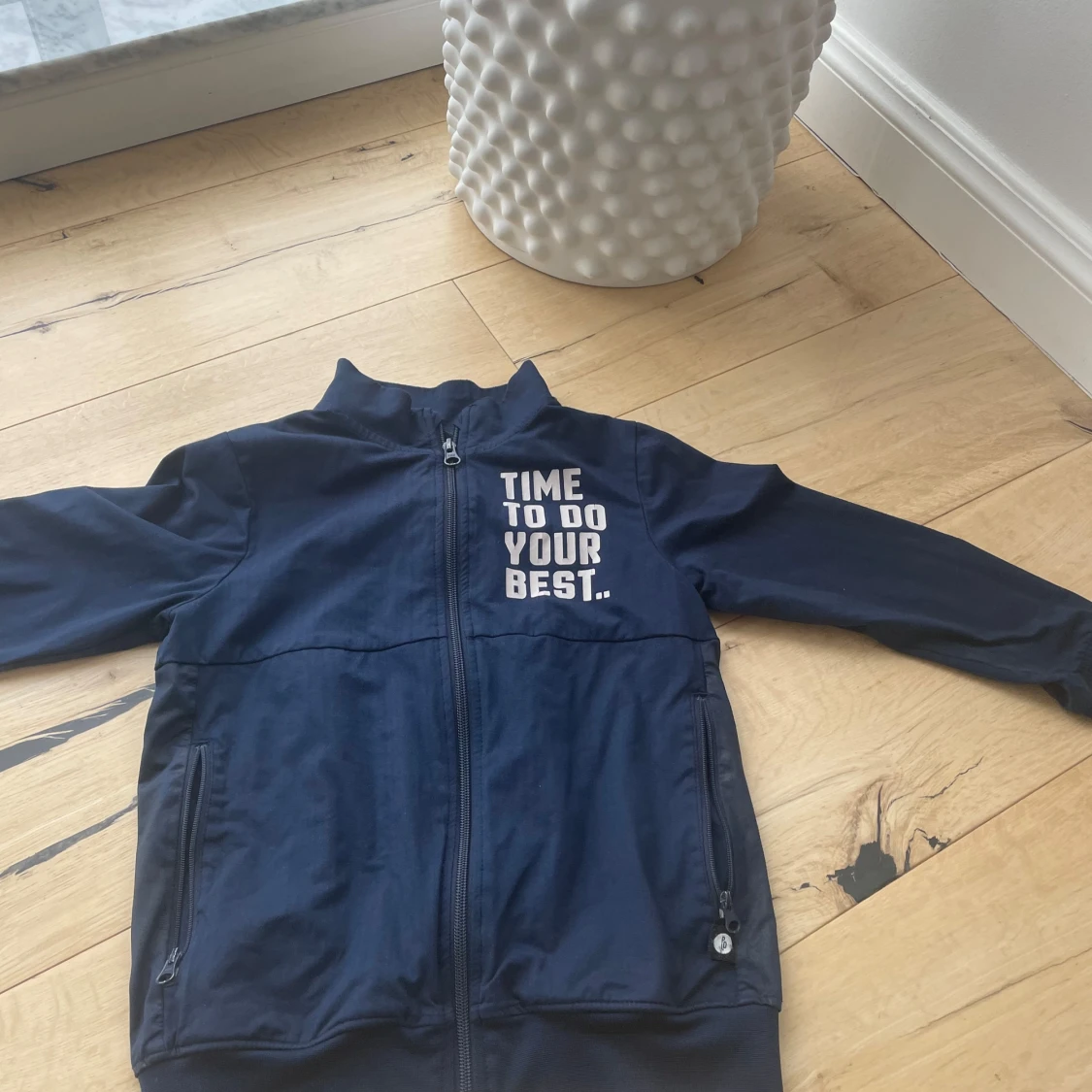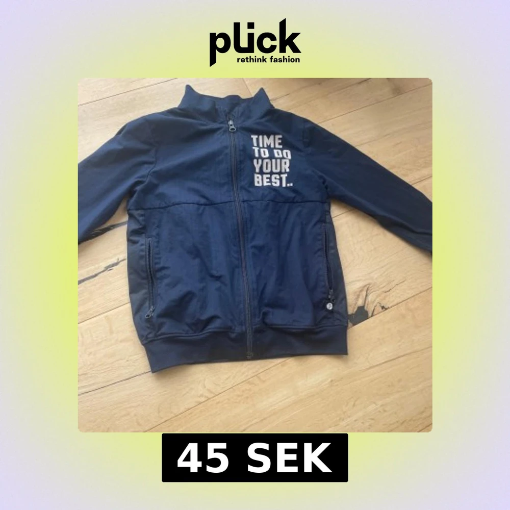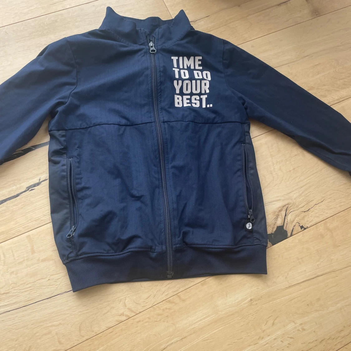Snygg marinblå vindjacka från Pomp de Lux med trycket 'TIME TO DO YOUR BEST.' på bröstet. Jackan har hel dragkedja framtill, två fickor med dragkedja och ribbade muddar. Perfekt för dig som gillar sportig och clean stil.