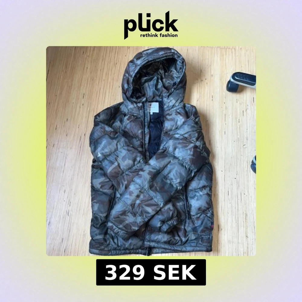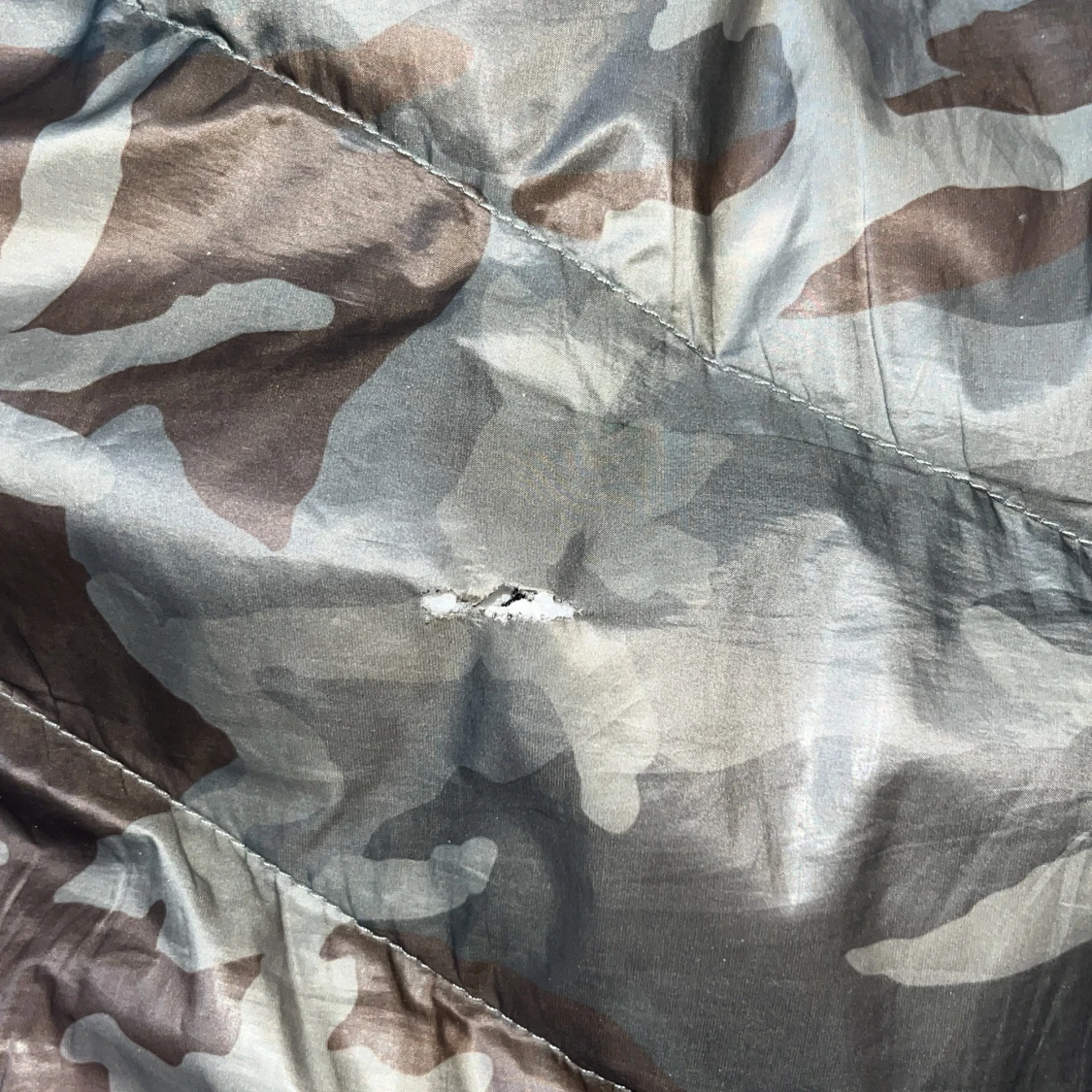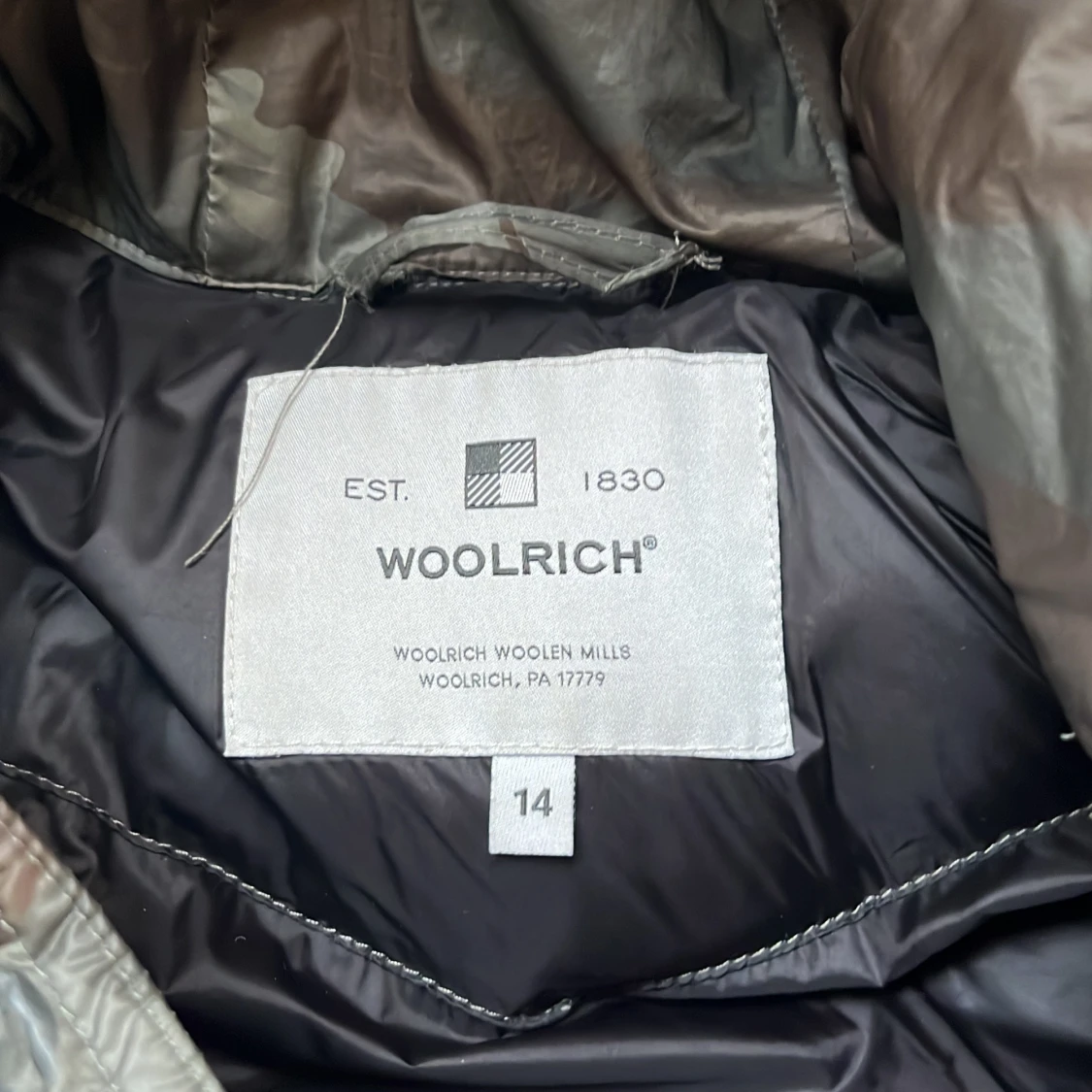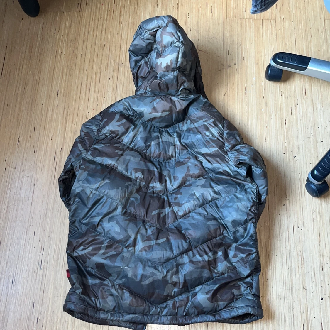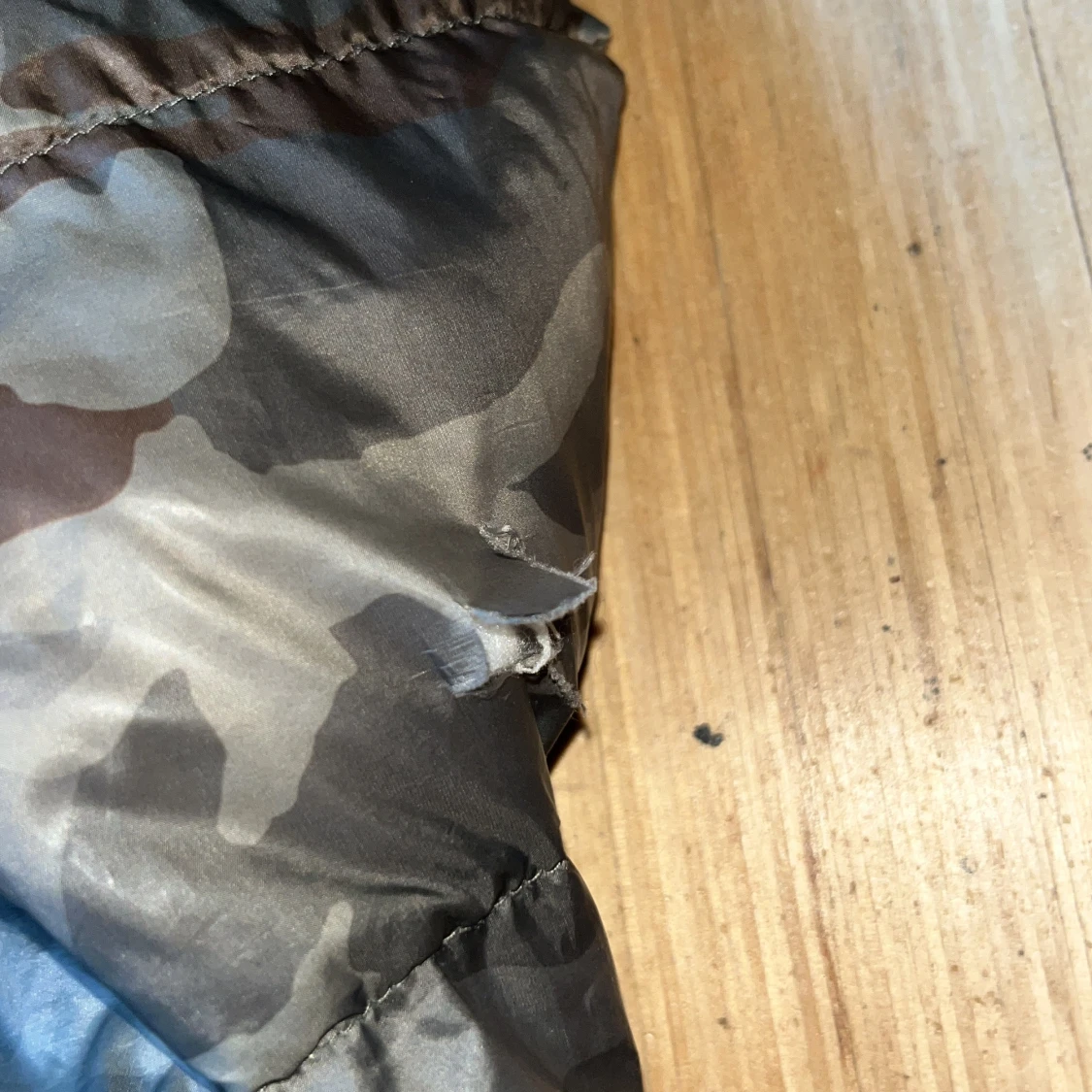Säljer en woolrich camouflage pufferjacka med huva. Jackan har en dragkedja framtill och är perfekt för kyligare dagar. Den har ett klassiskt camo-mönster i gröna och bruna toner. Jackan har två små hål. Ett bakom nertill och ett på H. Arm