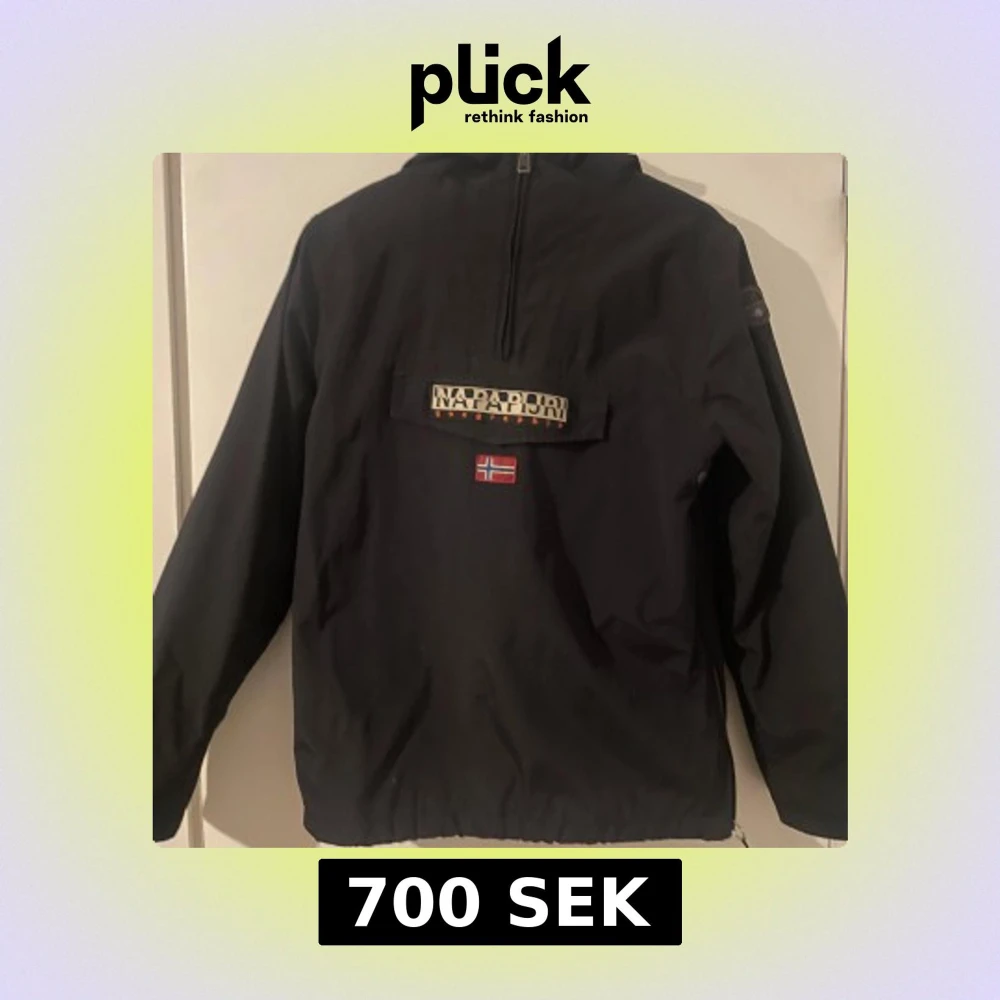 Svart vindjacka från Napapijri med halv dragkedja och stor logga samt norsk flagga på bröstet. Jackan har huva, fleecefoder på insidan och praktisk magficka med lock. Perfekt för kyliga dagar. Tar emot byten.