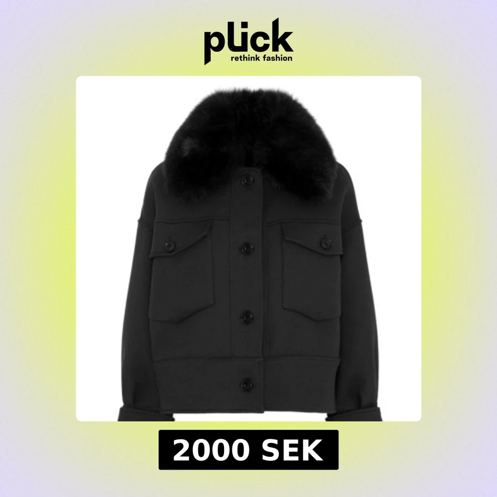 Meotine jacka - Stilren svart jacka med bred fuskpäls-krage och stora bröstfickor med lock. Jackan har knäppning framtill med svarta knappar och en boxig, croppad passform. Perfekt för dig som vill ha en edgy och trendig look.