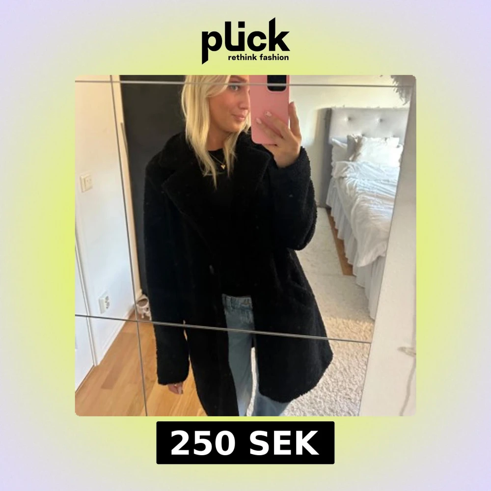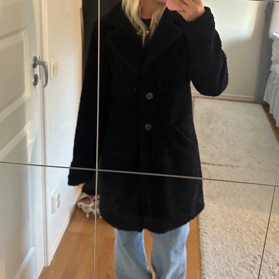 Mysig svart teddyjacka med stora slag och två knappar framtill. Jackan har en rak passform och är lite längre i modellen (se bild). Skriv för fler bilder💓💓använd 2 gånger