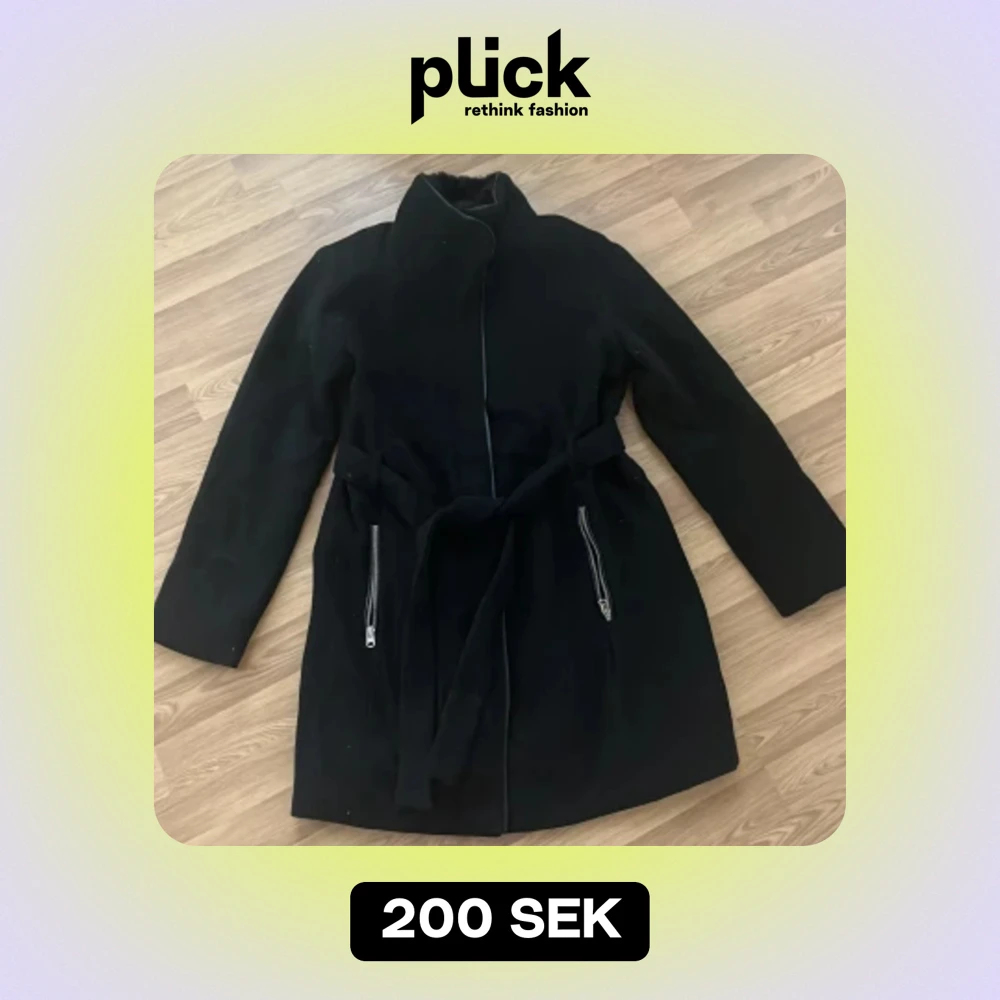 Säljer en stilren svart kappa med bälte i midjan. Den har långa ärmar och dragkedjor på fickorna. Storklek M, aldrig andvänd