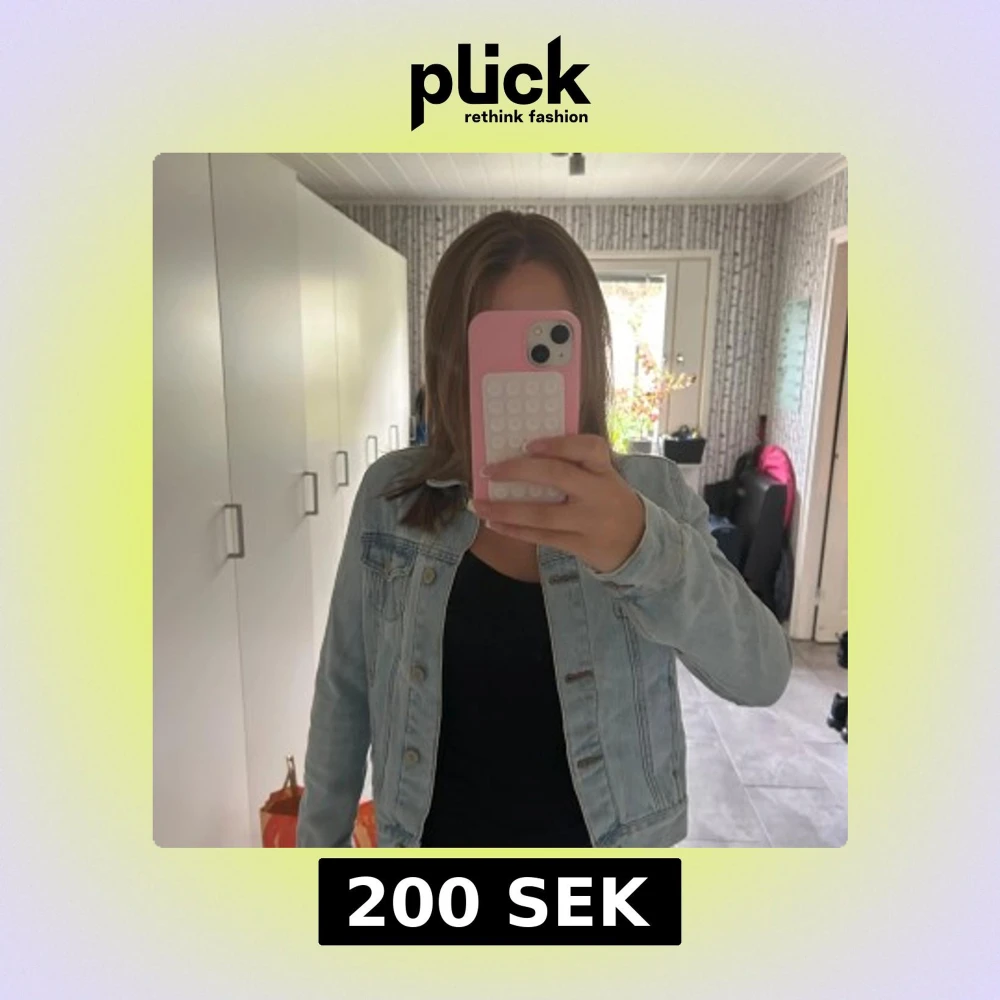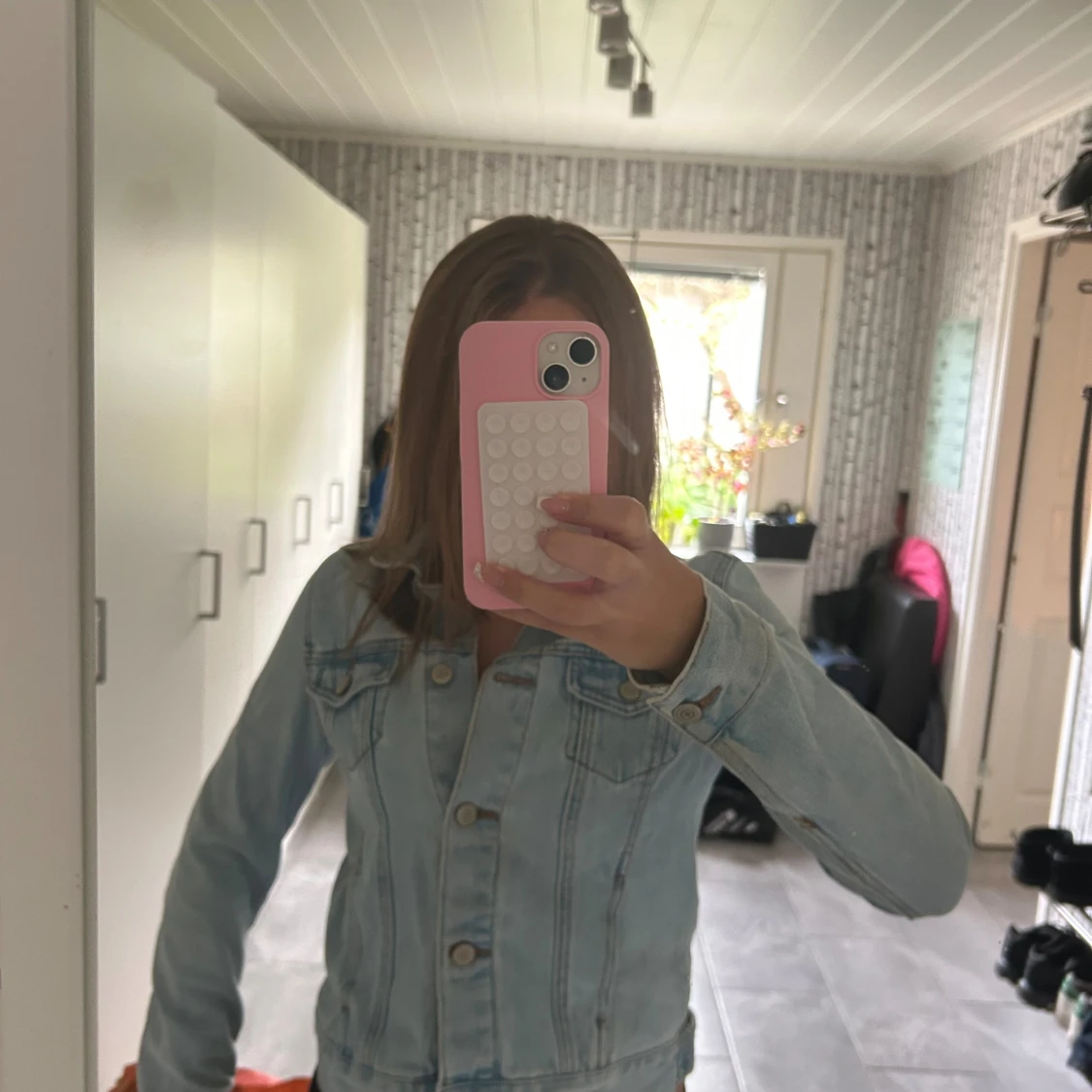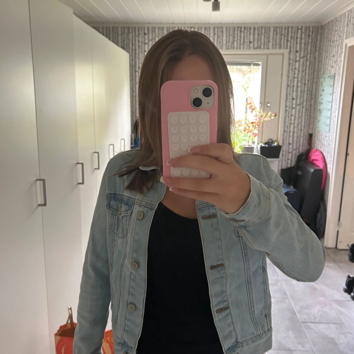 Säljer en snygg ljusblå jeansjacka med klassisk passform och silverfärgade knappar framtill. Jackan har två bröstfickor med lock och sömmar som ger en schysst look. Perfekt att slänga på sig över en hoodie eller t-shirt.
