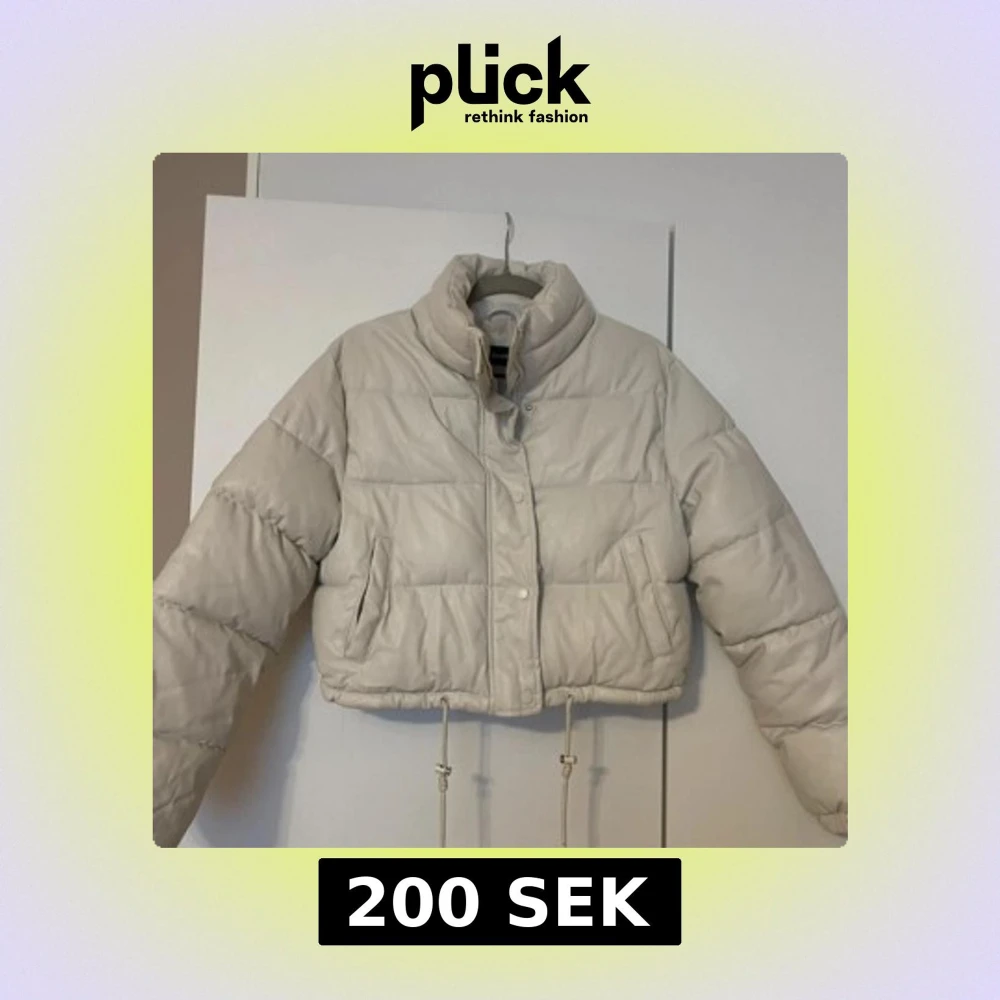 Snygg beige/ljusgrå pufferjacka med croppad passform och hög krage. Jackan har långa ärmar, dragkedja och knappar framtill samt justerbar dragsko i nederkant.