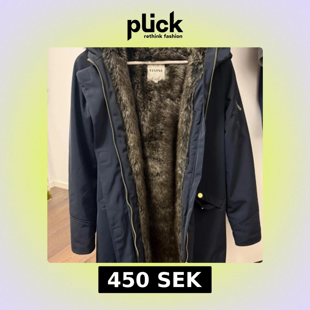 Snygg mörkblå parkajacka från Elvine med fuskpälsfoder. Jackan har dragkedja och knappar framtill samt praktiska fickor. Perfekt för kyliga dagar.