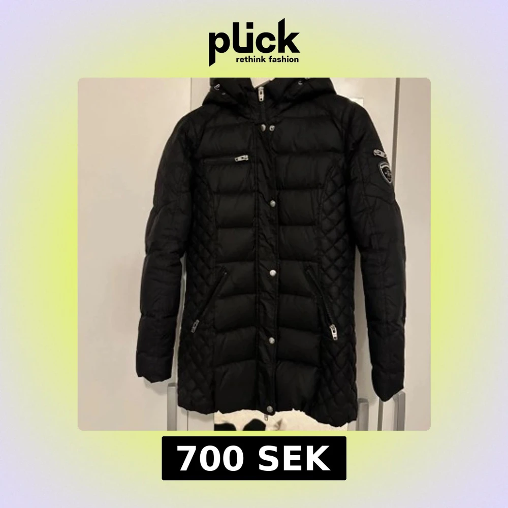 Svart dunjacka från Rockandblue med huva, quiltade detaljer och flera dragkedjefickor. Jackan har en längre modell, snygga silvriga knappar och Rockandblue-logga på ärmen. Perfekt för kalla dagar och riktigt stilren look.
