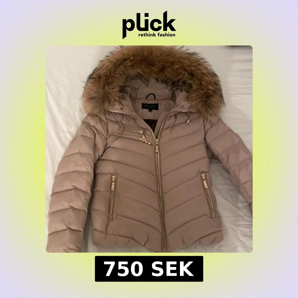 Snygg beige pufferjacka från Hollies med stor huva och fluffig fuskpäls. Jackan har guldfärgade dragkedjor, flera fickor och ett emblem på ärmen. Perfekt för kalla dagar och riktigt trendig look.