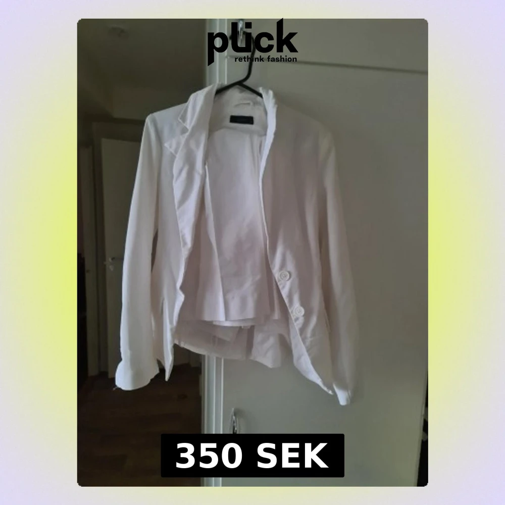 Stilren vit kavaj med klassisk krage och två knappar framtill. Lätt figursydd modell med långa ärmar och enkel design. Perfekt för att lyfta vilken outfit som helst med en fräsch och clean look. Med byxor till.