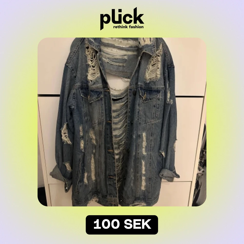 Säljer en riktigt cool och sliten jeansjacka i blått. Den har en oversized passform och är full av slitningar både fram och bak, vilket ger den en grunge-stil. Perfekt för höst och vår när du vill ha en avslappnad look. Jackan har långa ärmar och klassisk krage.