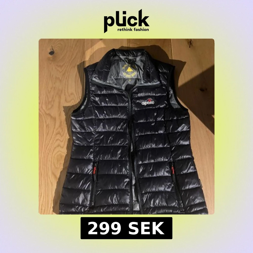 Snygg svart dunväst från Aptilo med quiltad design och hög krage. Västen har två fickor med dragkedja och broderad logga på bröstet. Perfekt att slänga över en hoodie eller tröja när det är kyligt ute. Det ända negativa är att kedjan är söder men går säkert att lagas annars så är västen som ny.