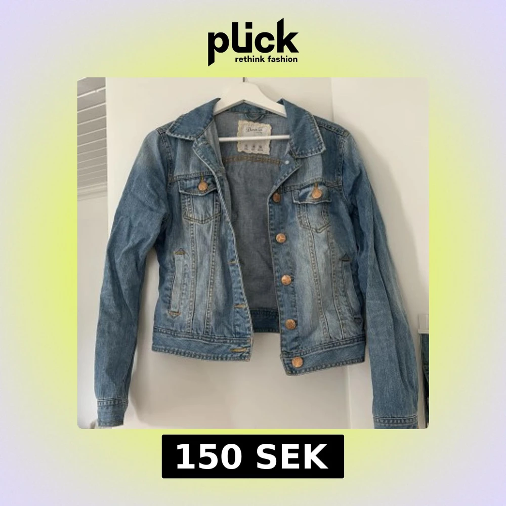 Säljer en blå lite tajtare jeansjacka med guldiga knappar och två bröstfickor. Jackan har lång ärm, krage och snygga sömdetaljer. Är i storlek 38 men skulle säga att den passar 36 bättre