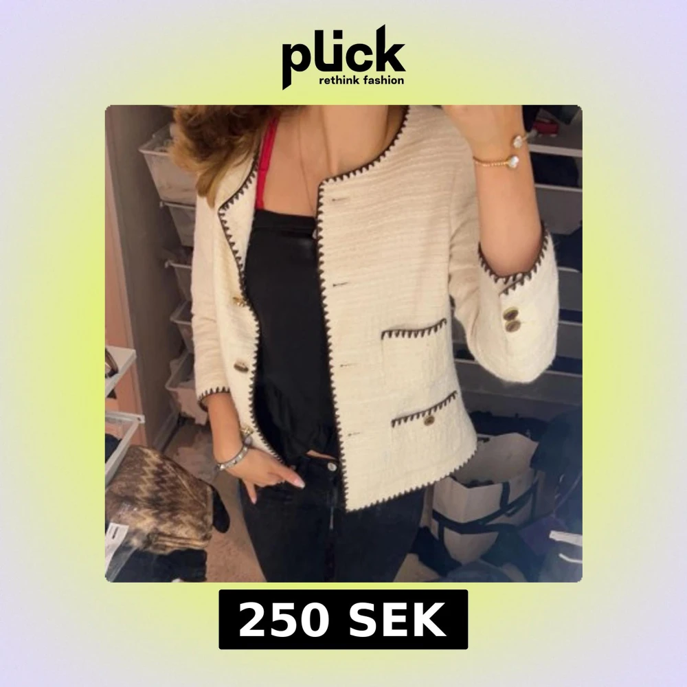 Elegant vit kavaj med svarta kantdetaljer och guldknappar. Den har en klassisk design med två framfickor och en rund halsringning. Perfekt för en stilren look. Vet inte märker -> köpt begagnad. Storleken är också lite oklar men jag bär S så skulle säga xs/s