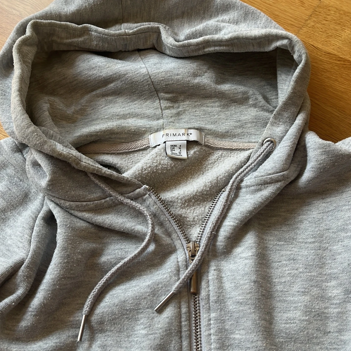 Mysig grå hoodiejacka från Primark med dragkedja hela vägen, huva med snörning och två stora fickor framtill. Perfekt för chill dagar eller när du vill ha en enkel och clean look. Tillverkad i mjuk bomullsblandning för extra komfort.