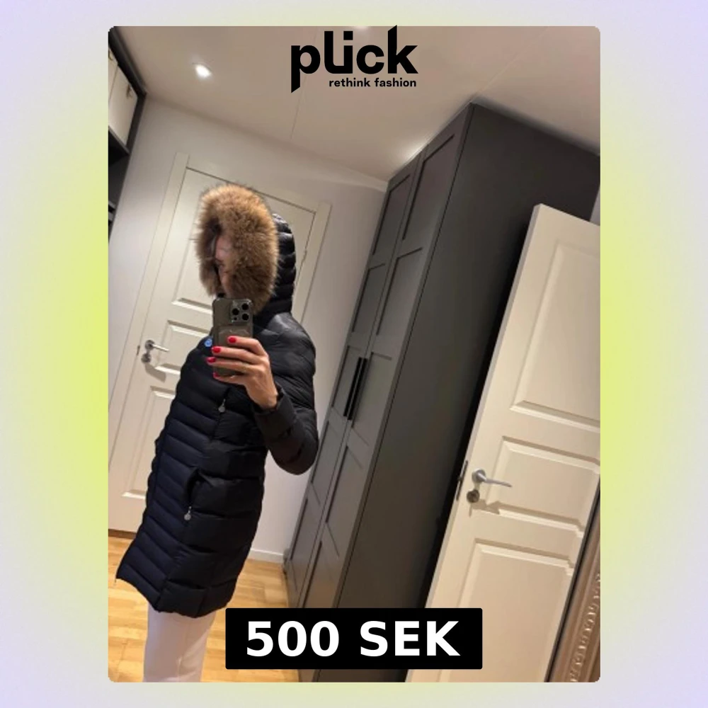 Snygg svart dunjacka med fluffig päls runt huvan. Jackan är quiltad och har en lång, smal passform med dragkedja framtill och praktiska fickor med dragkedja. Perfekt för kalla dagar och ger en cool siluett.