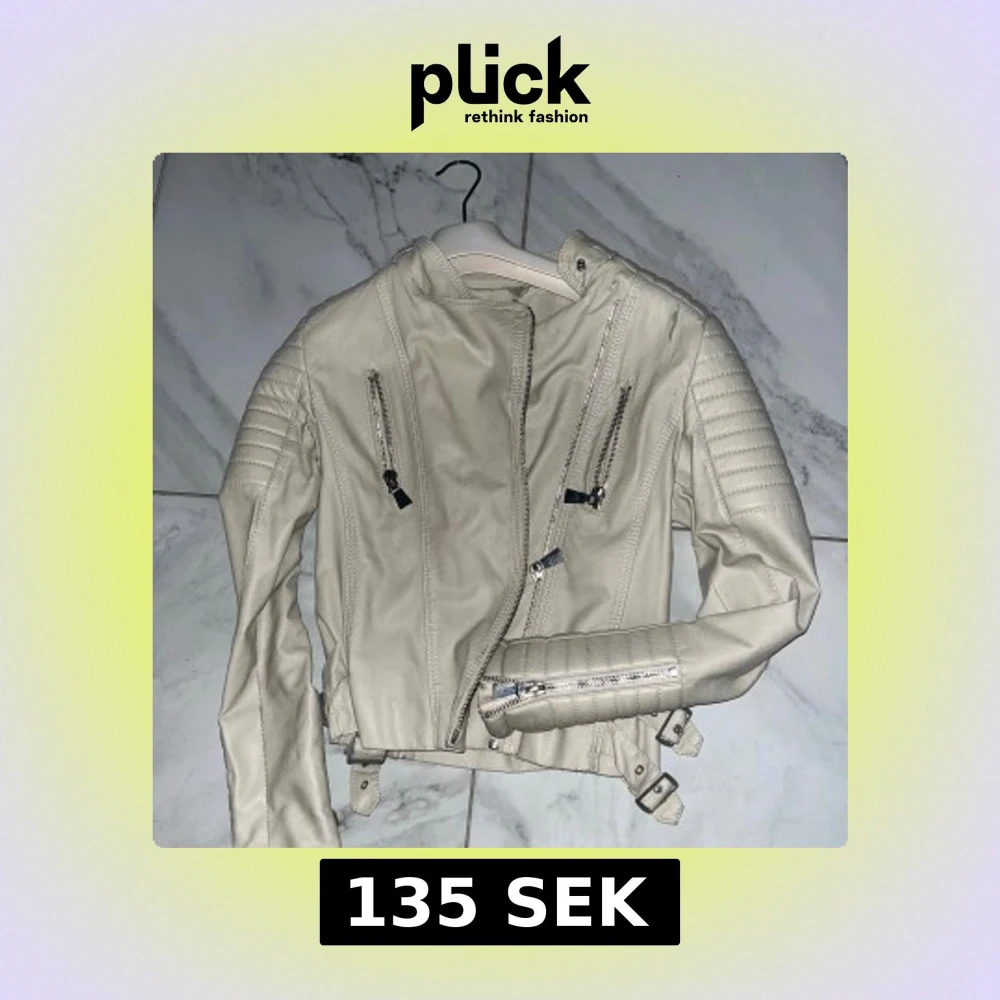 Snygg beige skinnjacka med coola detaljer som silvriga dragkedjor, quiltade partier på axlar och ärmar samt bälten vid midjan. Jackan har en asymmetrisk dragkedja framtill och flera fickor med dragkedja. Perfekt för dig som vill ha en edgy look.