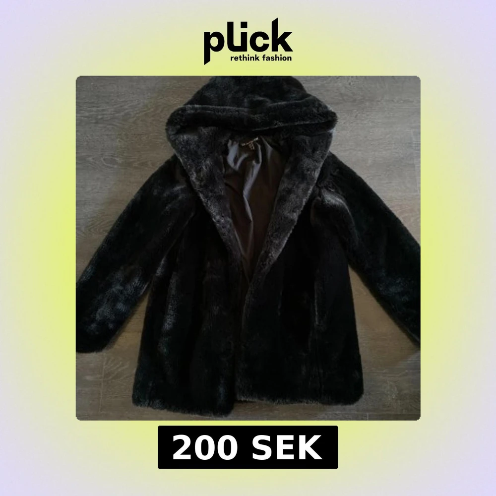 Säljer en mysig svart jacka i pälsimitation med huva. Storlek S.