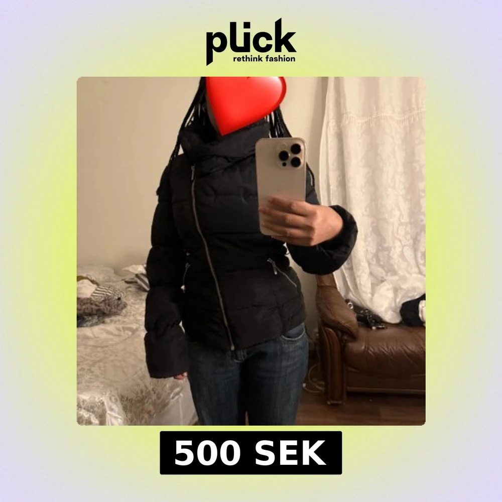 Säljer en svart pufferjacka med stor, mysig krage och sned dragkedja framtill. Jackan har två fickor med dragkedja och är vadderad för extra värme. Perfekt för kalla dagar och har en cool, modern look som passar till jeans.