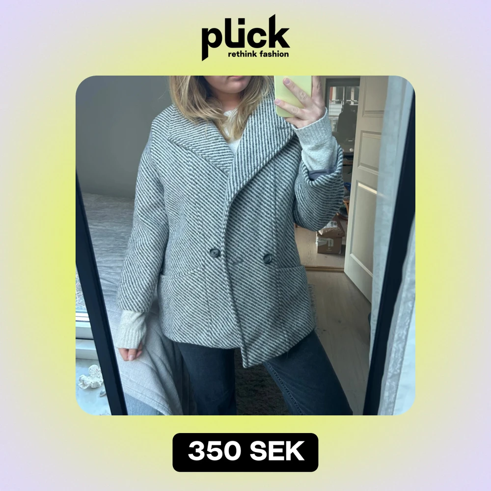 Säljer en stilren grå randig kappa med knappar framtill. Jackan har en klassisk krage och långa ärmar, perfekt för kyligare dagar. Passar bra till både jeans och mer uppklädda outfits.