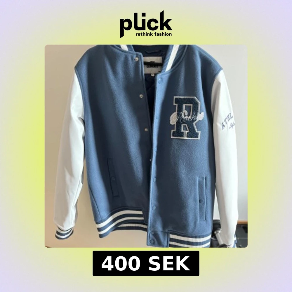 Blå och vit bomberjacka från New Garments med stora broderade bokstäver 'ROCKET' på ryggen och ett R på bröstet. Jackan har vita ärmar, ribbade muddar med ränder och tryckknappar framtill.