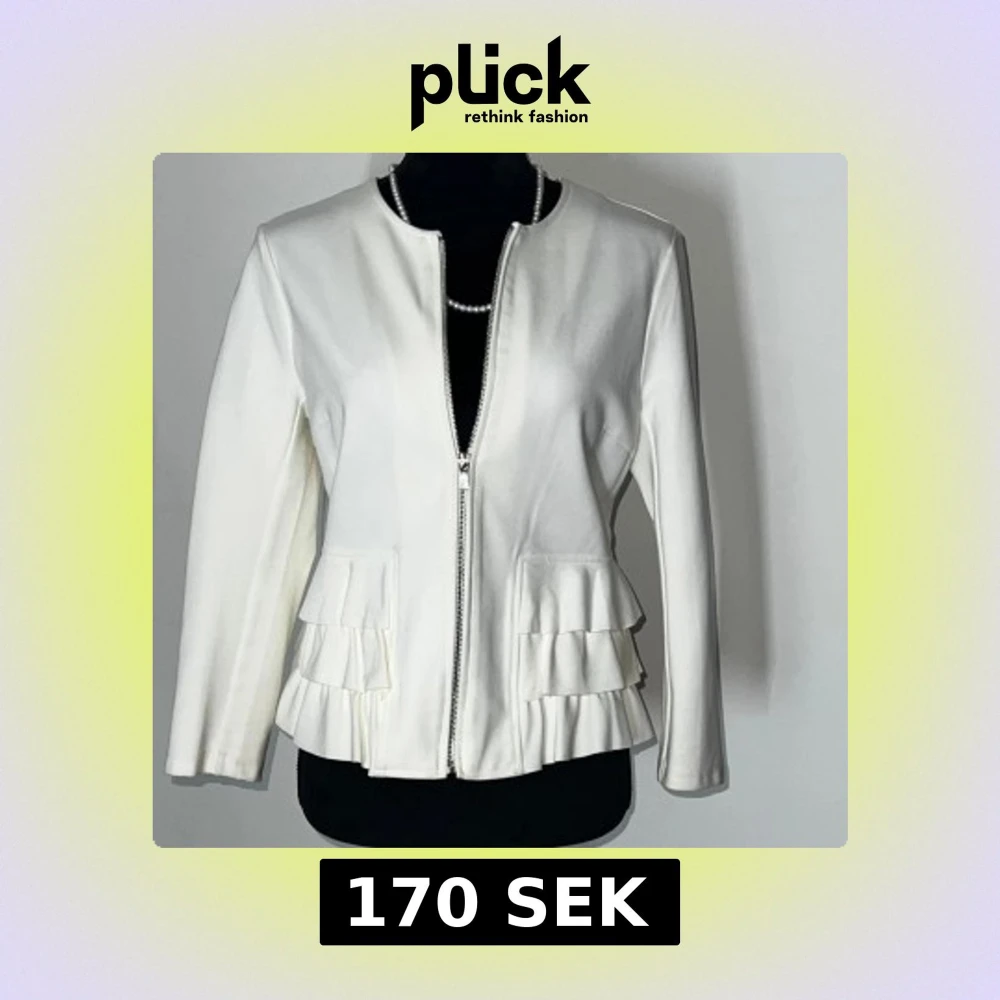 Elegant vit jacka med dragkedja framtill och volangdetaljer på fickorna. Jackan har en stilren design med långa ärmar. Perfekt för en chic och sofistikerad look.