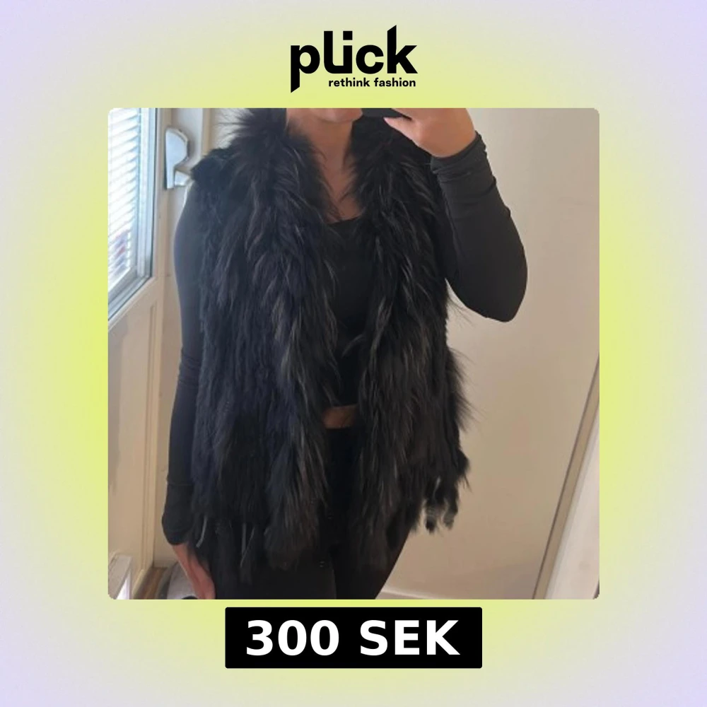 Säljer en svart pälsväst med lång, fluffig päls och öppen front.