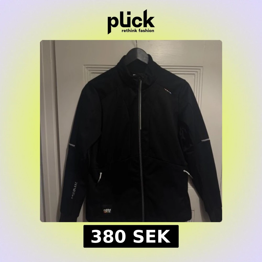 Svart vindjacka från Rukka med hel dragkedja och höga krage. Jackan har reflexdetaljer på ärmarna och små färgglada detaljer vid bröstet och ryggen. Två fickor med dragkedja framtill. Perfekt som skidjacka eller andra utomhusaktiviteter. I mycket gott skick. Storlek 38.