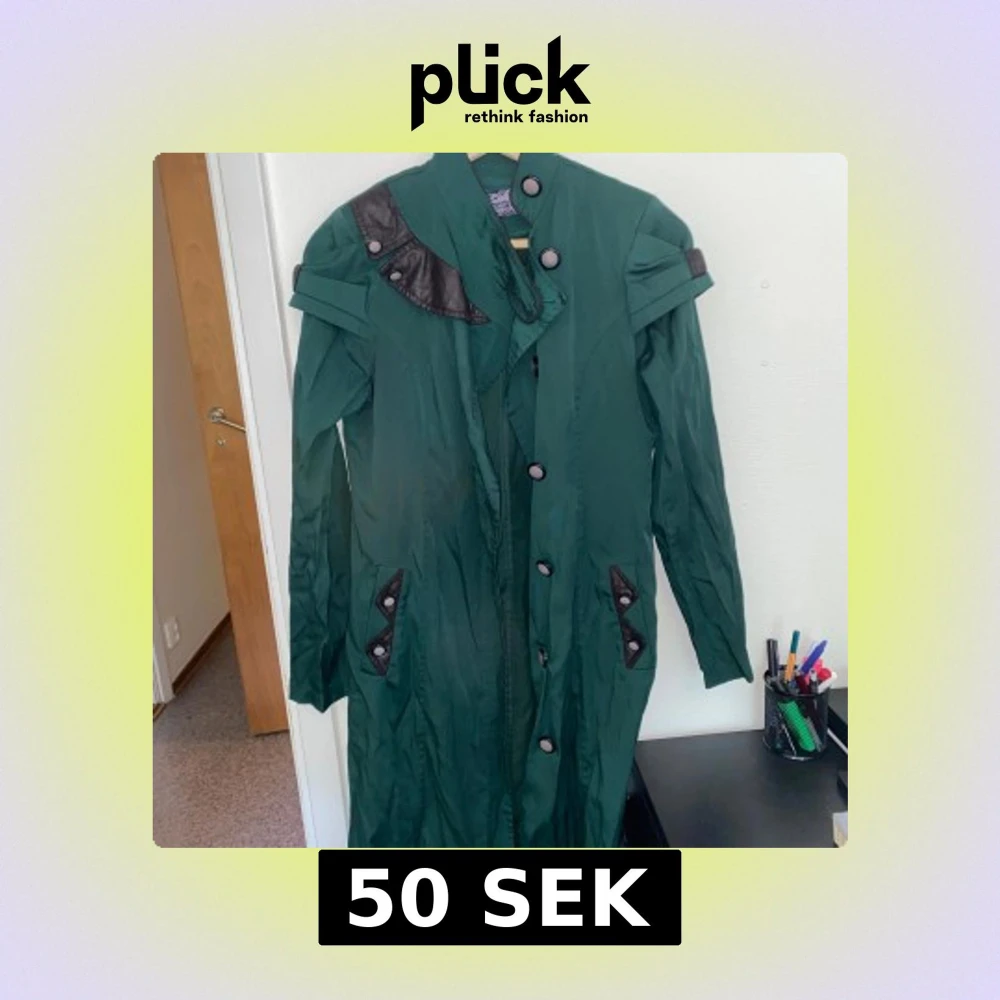 Snygg grön trenchcoat med svarta skinnliknande detaljer på axlar och fickor. Jackan har långa ärmar, knappar framtill och en cool, asymmetrisk krage. Perfekt för dig som vill sticka ut med en unik och stilren look.