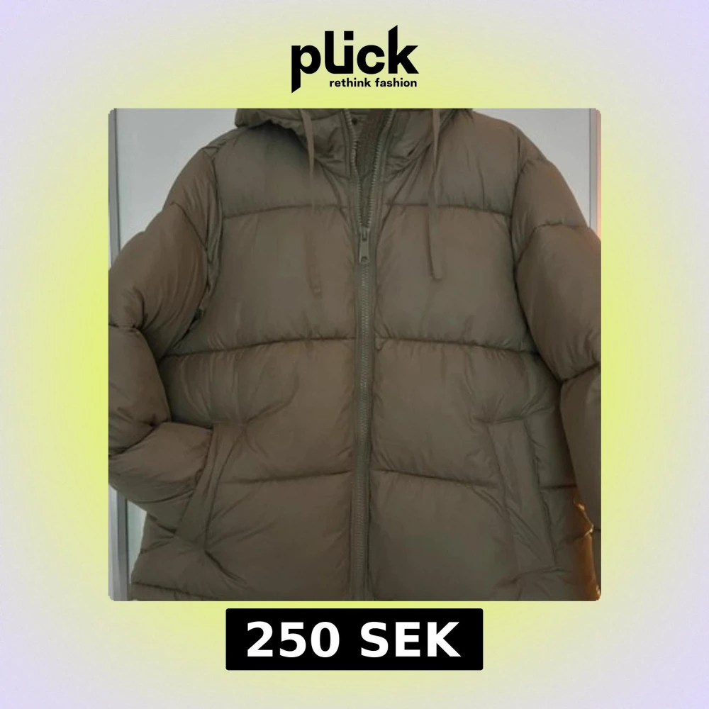 Säljer en mysig beige/grön dunjacka från H&M. Jackan har en dragkedja framtill och en stor huva för extra värme. Perfekt för kyliga dagar med sin pufferdesign som ger en skön och avslappnad look.