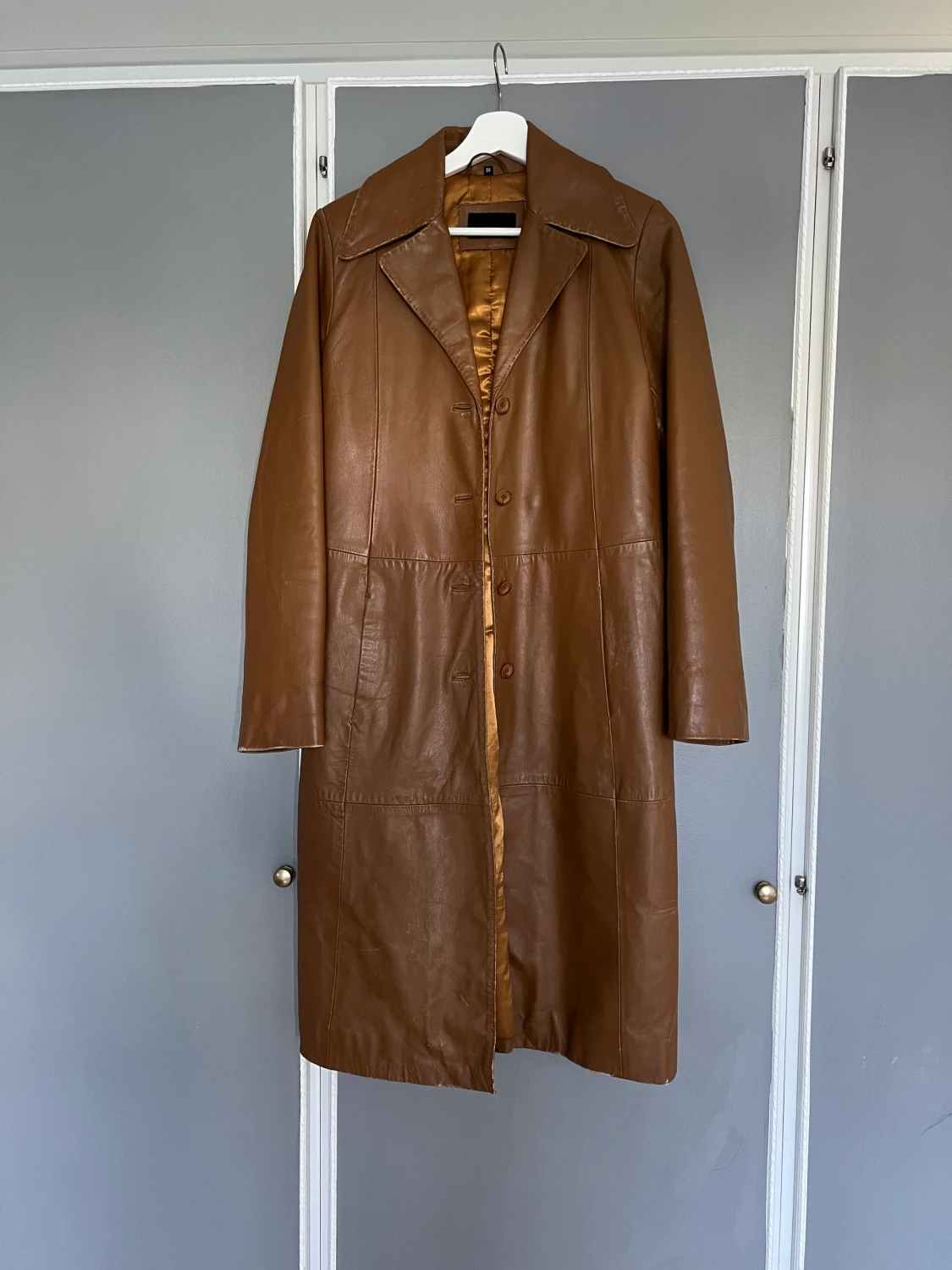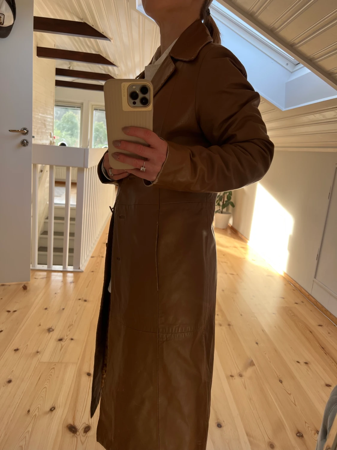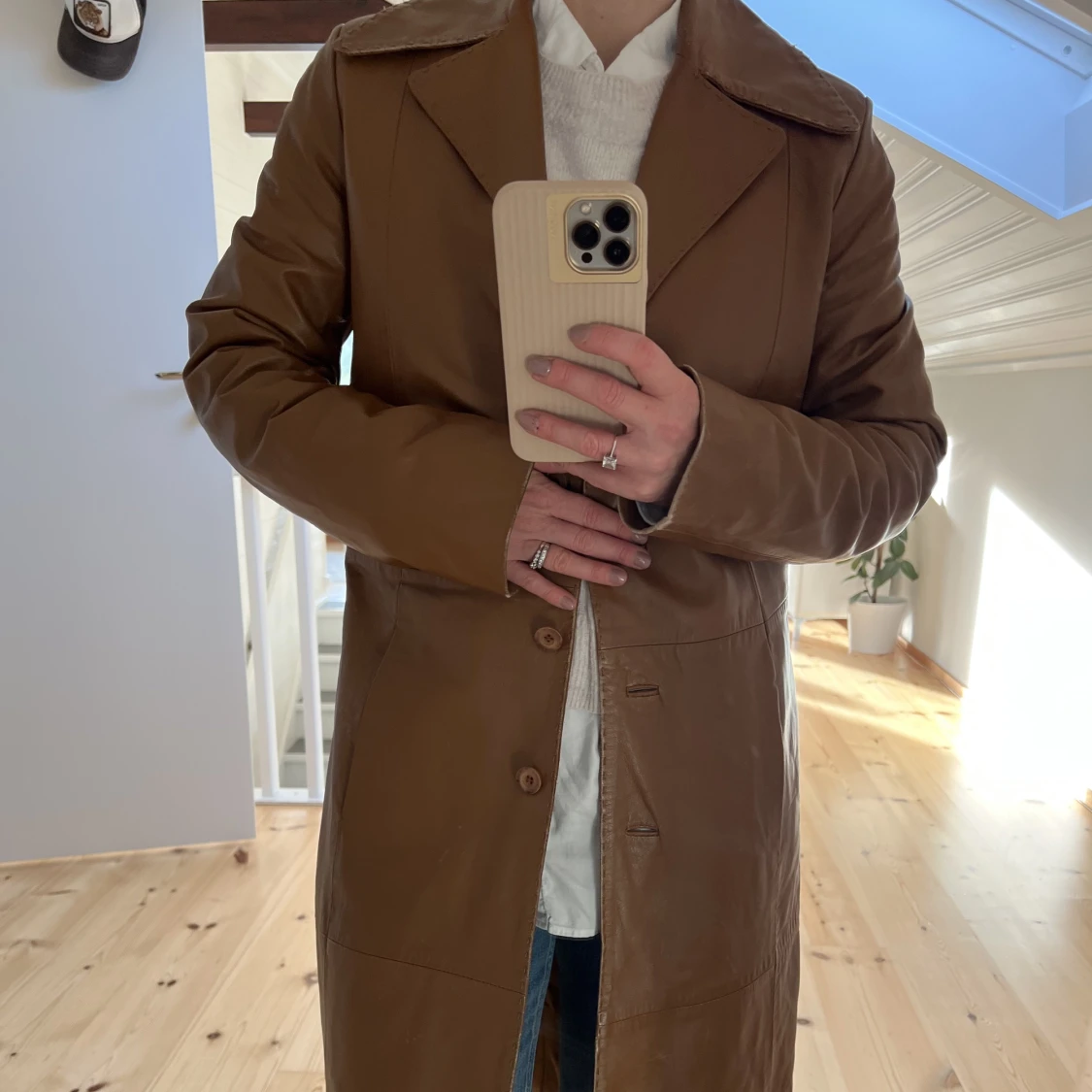 Skinnkappa vintage 90-tal Cognacsfärgad kappa i äkta skinn med fin patina. Damstorlek 38. Jag brukar ha 36 och den sitter bra på mig.