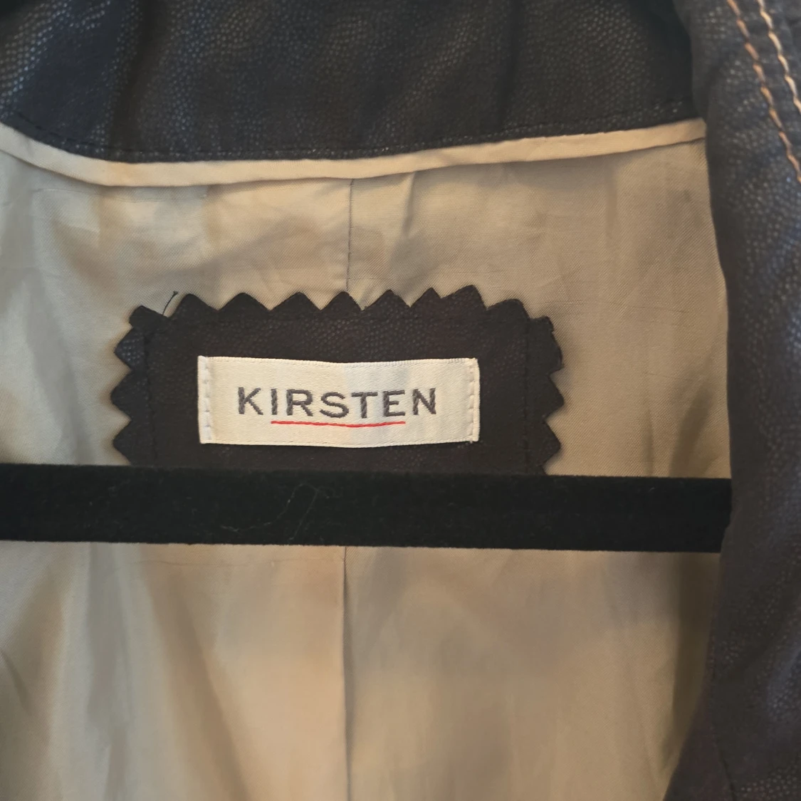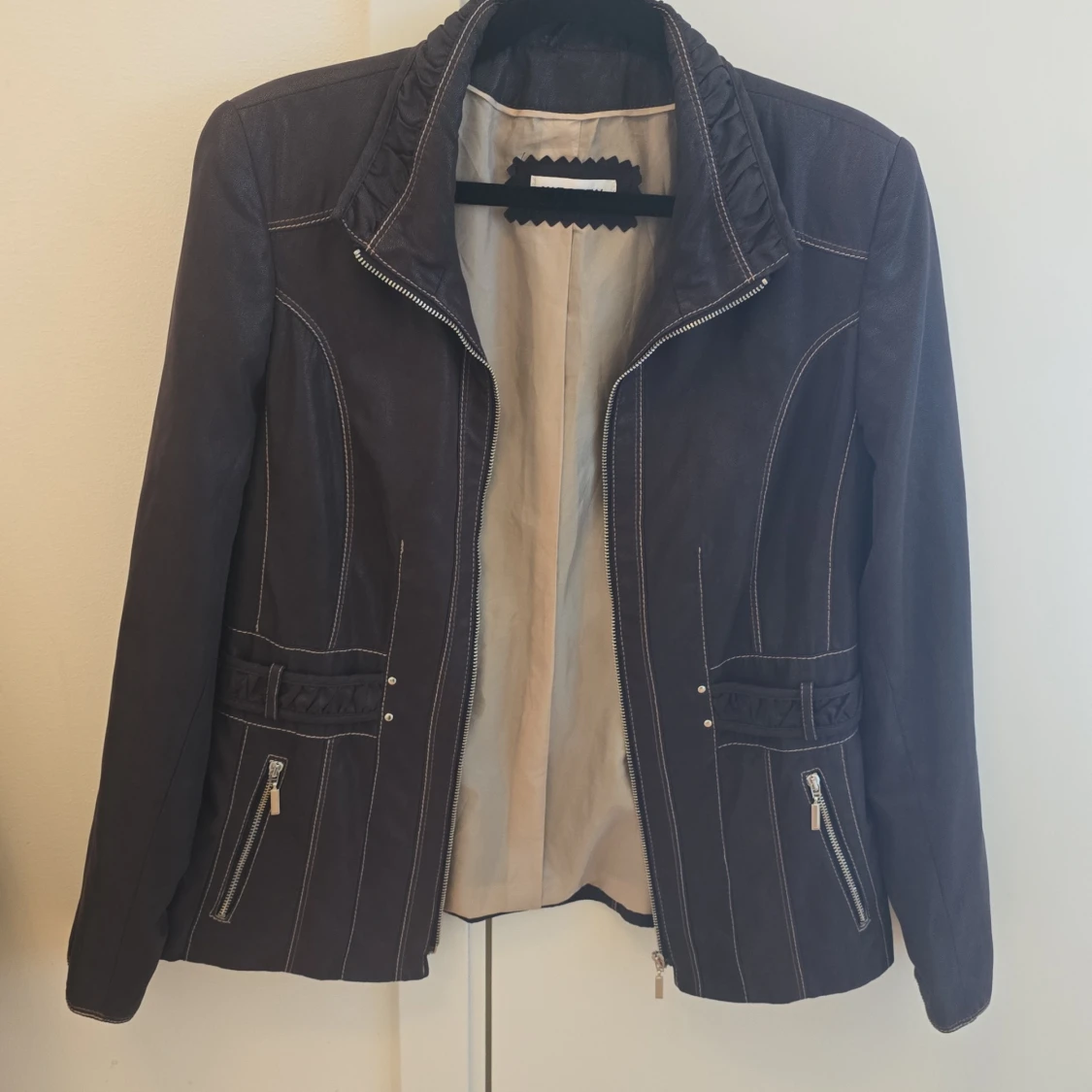 Snygg Brun skinnjacka från Kirsten med dragkedja framtill och två fickor med dragkedjor. Jackan har en stilren design med vita sömmar som ger en cool kontrast. Perfekt för att ge din outfit en edgy touch.