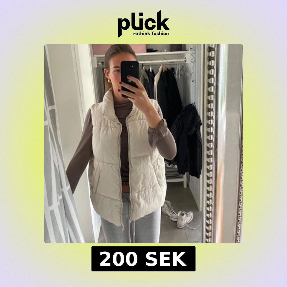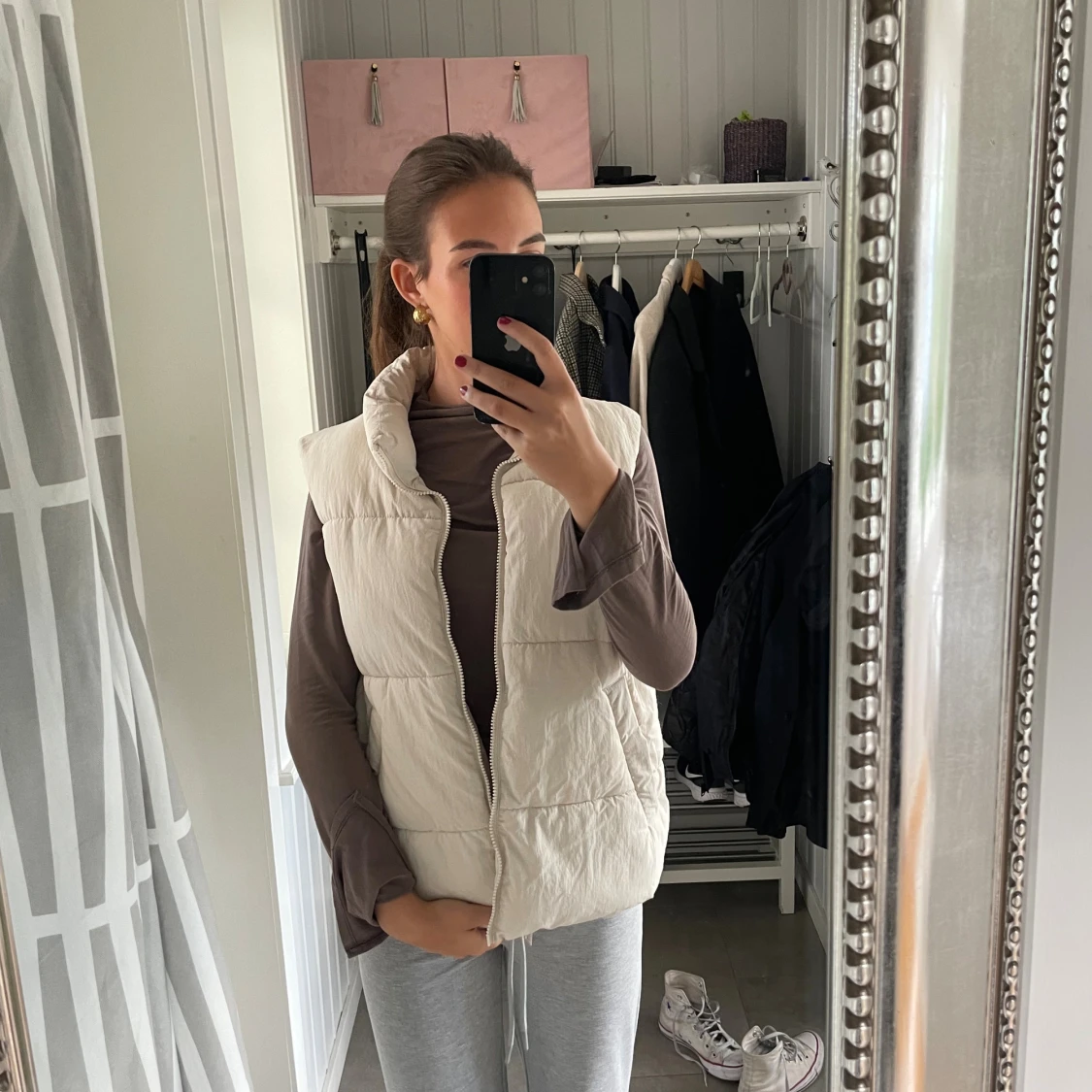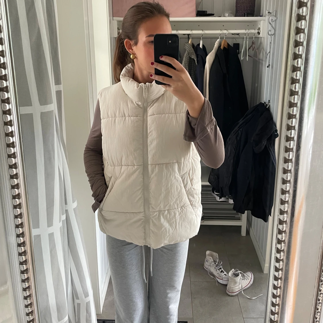 Säljer en beige quiltad dunväst med hög krage och dragkedja framtill. Västen har en loose passform och är perfekt att slänga över en hoodie eller långärmad tröja. Bra skick. Passar från s-m