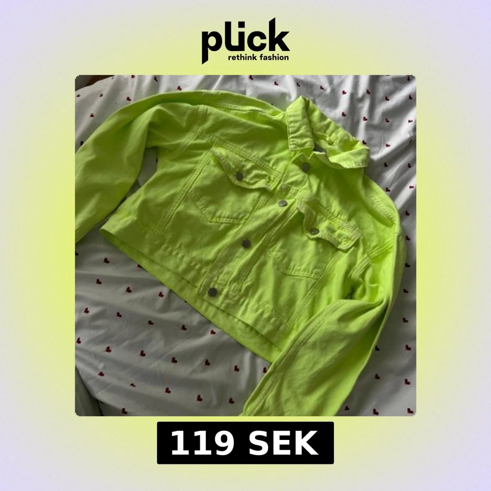 Säljer en croppad jeansjacka i en riktigt poppig neon färg. Jackan har klassisk krage, silverfärgade knappar och två bröstfickor med lock. Perfekt för dig som vill sticka ut och addera färg till din outfit.
