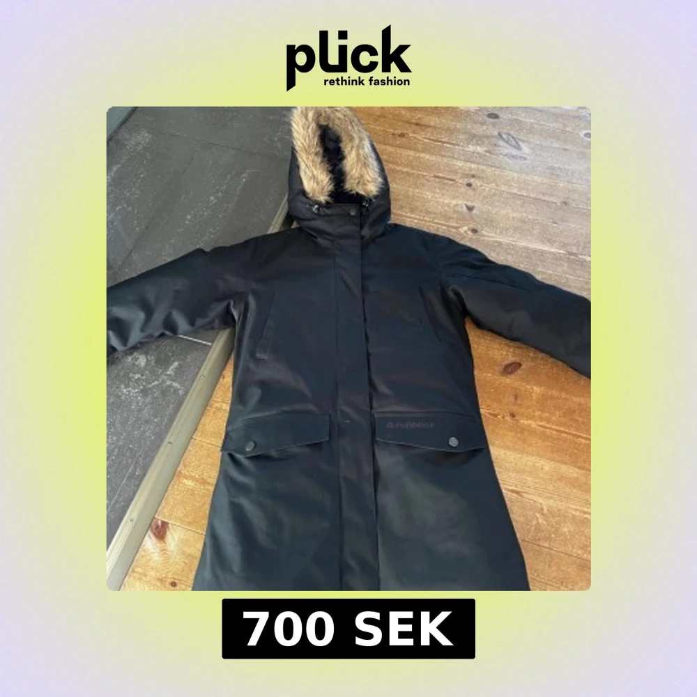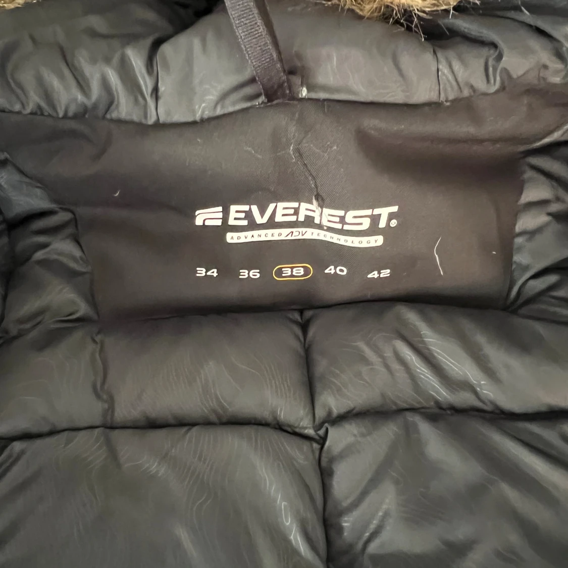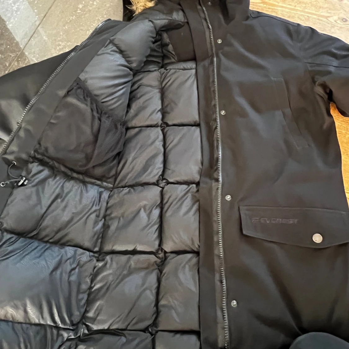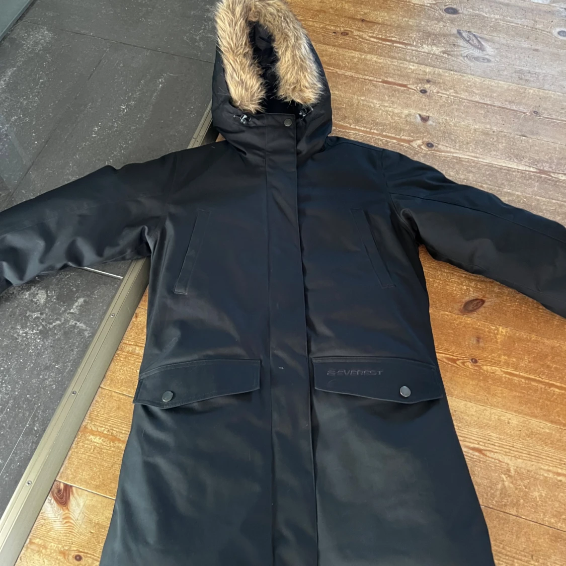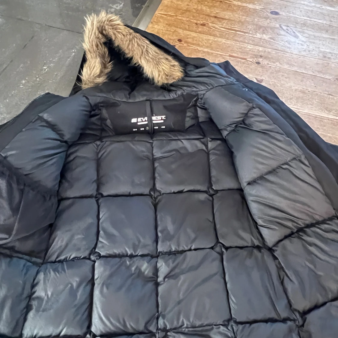 Svart lång dunjacka från Everest med huva och fuskpäls. Jackan har dragkedja, tryckknappar, två stora fickor med lock och två snedställda bröstfickor. Insidan är quiltad för extra värme och komfort.