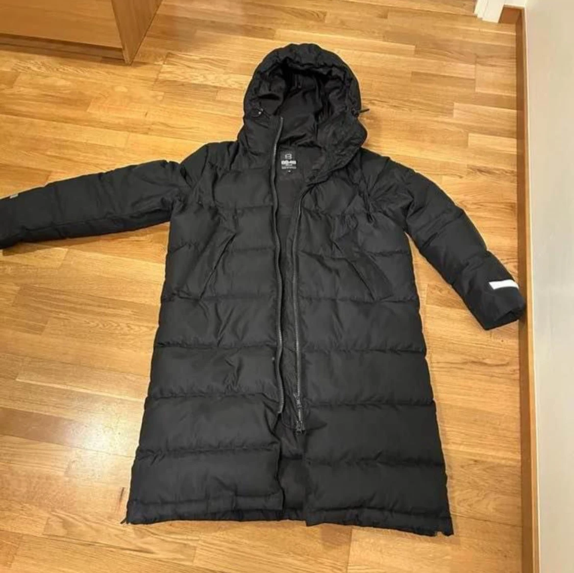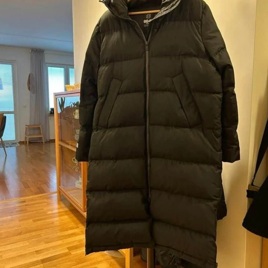 Säljer en svart lång dunjacka från 8848 Altitude med huva och dragkedja framtill. Jackan har två stora snedställda fickor och quiltad design som ger en schysst puffer-look. Perfekt för kalla dagar när du vill hålla värmen och ändå se stilren ut.