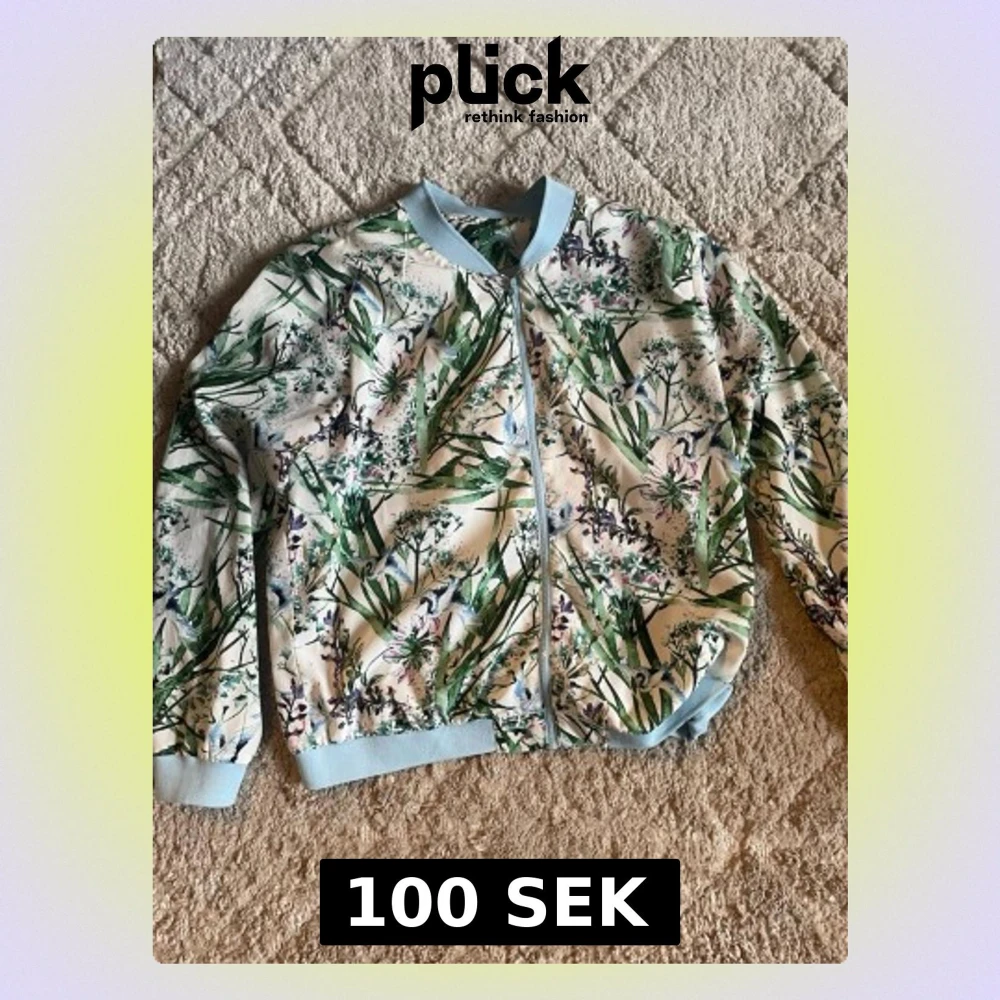 Säljer en snygg bomberjacka med blommigt mönster i grönt, blått och lila på vit botten. Jackan har ljusblå muddar, dragkedja framtill och är långärmad. Perfekt för dig som vill sticka ut med en fräsch och färgglad look.
