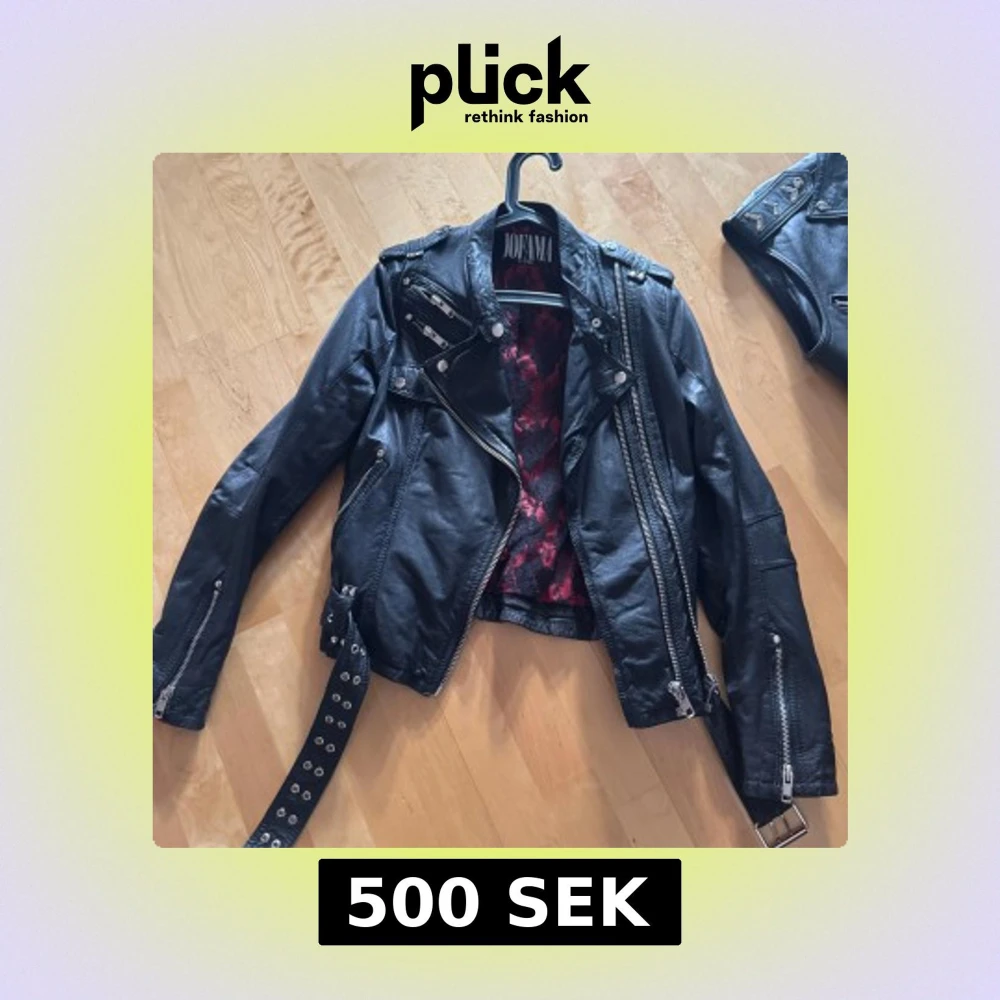 Snygg svart skinnjacka från Jofama med coola detaljer som dragkedjor och bälte. Insidan har ett rött och svart blommigt mönster. Storlek 40 men funkar för en mindre person med