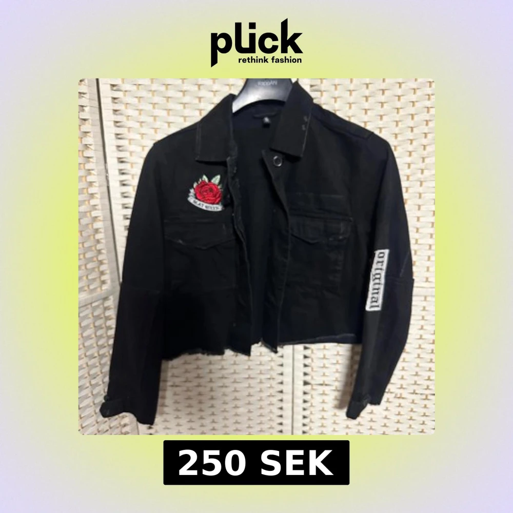 Helt ny svart lite kortare jeansjacka med tygmärken på. Använd några få gånger. Storlek 42.