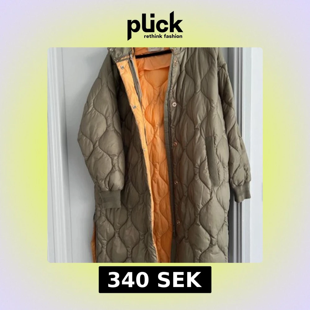 Säljer en lång quiltad pufferjacka från Soft Rebels i olivgrönt med härlig orange insida. Jackan har huva, ribbade muddar och både dragkedja och knappar framtill. Perfekt för dig som vill ha en chill och varm look under höst och vinter.