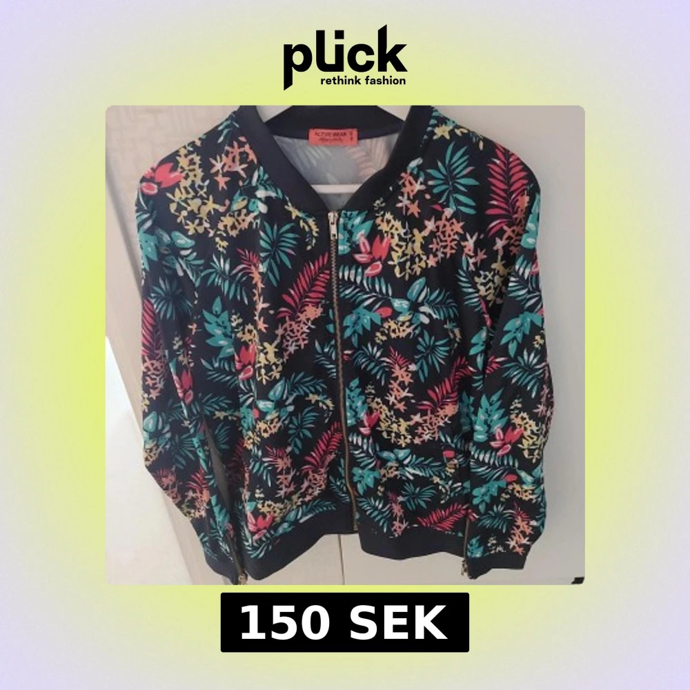 Färgglad bomberjacka med blommigt mönster i turkos, rosa, gul och röd på svart botten. Jackan har dragkedja framtill och ribbade muddar vid ärmslut och nederkant. Storlek 44/46 XL.Från rök och djurfritt hem.