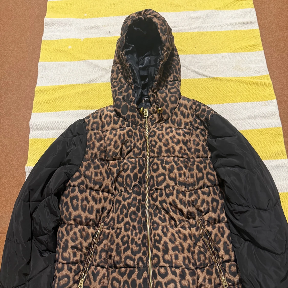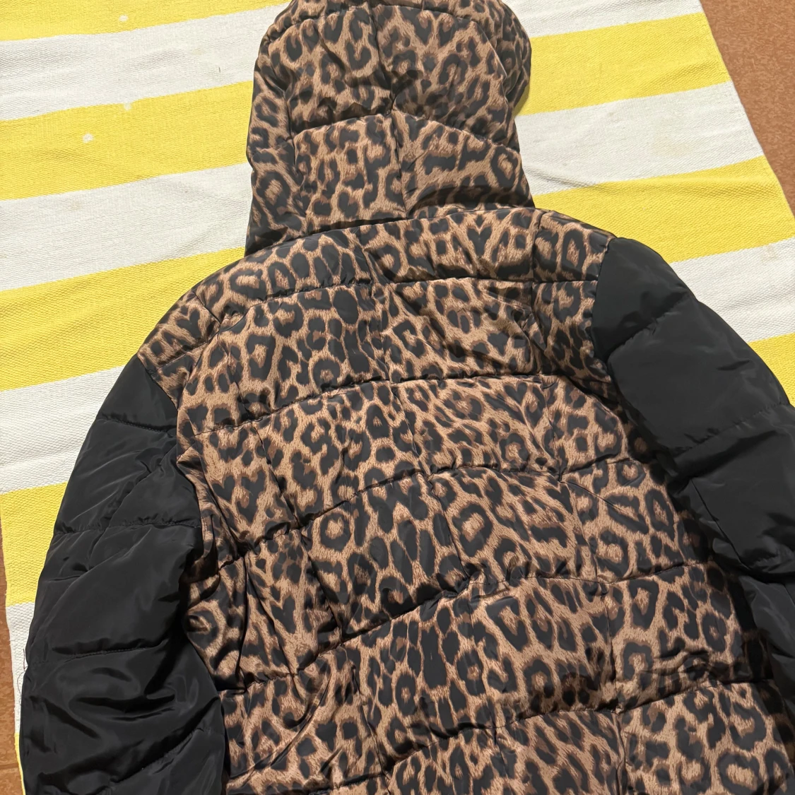 Säljer en fet pufferjacka från Rainbow med leopardmönster på kroppen och svarta ärmar. Jackan har huva, guldfärgade dragkedjor och två fickor framtill. Perfekt för dig som vill sticka ut i höst och vinter. Materialet är syntet och jackan är riktigt varm.