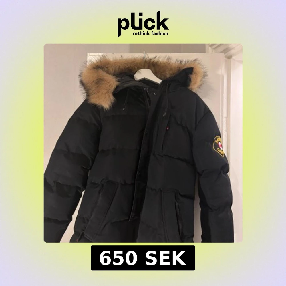 Priset är inte hugget i sten! Vid snabb affär går ner i pris. Snygg svart dunjacka från Zavetti Canada med pälsfodrad huva och broderad logga på ärmen.